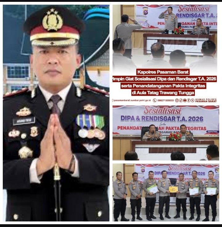 PASAMAN BARATÂ | Kepemimpinan yang tegas namun komunikatif kembali ditunjukkan Kapolres Pasaman Barat AKBP Agung Tribawanto, S.I.K., saat memimpin kegiatan Sosialisasi Daftar Isian Pelaksanaan Anggaran (DIPA) dan Rencana Distribusi Anggaran (Rendisgar) Tahun Anggaran 2026, sekaligus penandatanganan Pakta Integritas di Aula Tatag Trawang Tungga.
