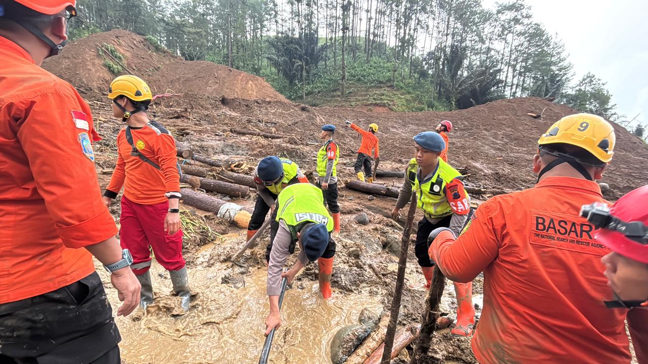 Dalam pencarian korban bencana Tim SAR Satbrimob Polda Jateng dibantu TNI, BPBD, dan Relawan. Personel gabungan tampak bekerja secara terkoordinasi di medan yang berat, dipenuhi lumpur dan material kayu, dengan melakukan pembersihan area, pemasangan peralatan evakuasi, serta penelusuran titik-titik rawan.