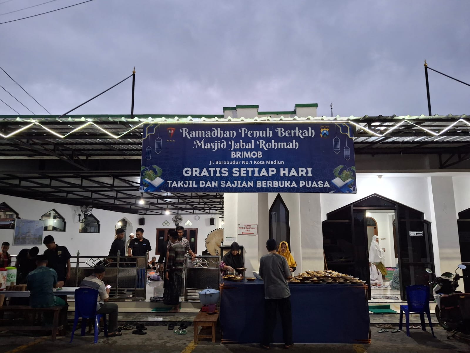 Madiun – Dalam rangka menyemarakkan bulan suci Ramadhan serta mempererat tali silaturahmi dengan masyarakat, anggota gabungan Staf Batalyon C Pelopor dan Kompi 4 Batalyon C Pelopor Satbrimob Polda Jatim melaksanakan kegiatan sosial berupa pembagian takjil gratis sebanyak 100 porsi setiap hari. Kegiatan tersebut dilaksanakan di Masjid Jabal Rahmah yang berada di lingkungan Mako Kompi 4 Batalyon C Pelopor.