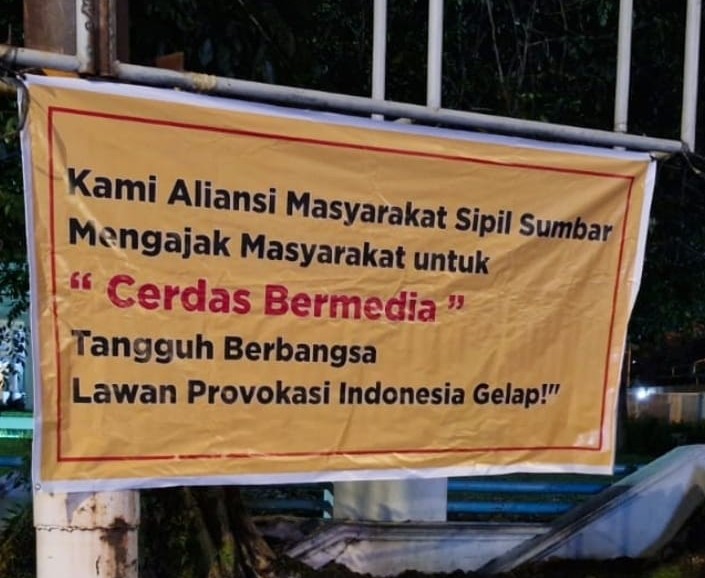 Pasalnya, spanduk itu berisi tentang yang bertuliskan “Cerdas Bermedia tangguh berbangsa lawan Provokasi Indonesia Gelap. Namun, tidak diketahui siapa yang memasang spanduk tersebut.