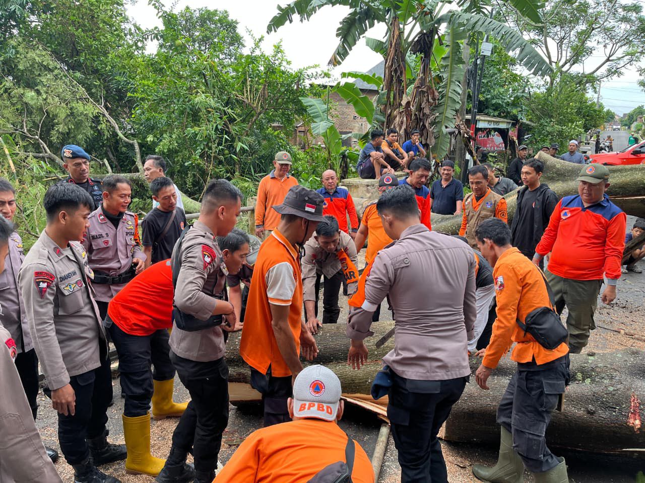 Brimob Batalyon C Pelopor dan BPBD Lampung Utara Bersihkan Pohon Tumbang di Desa Tanjung Harapan
