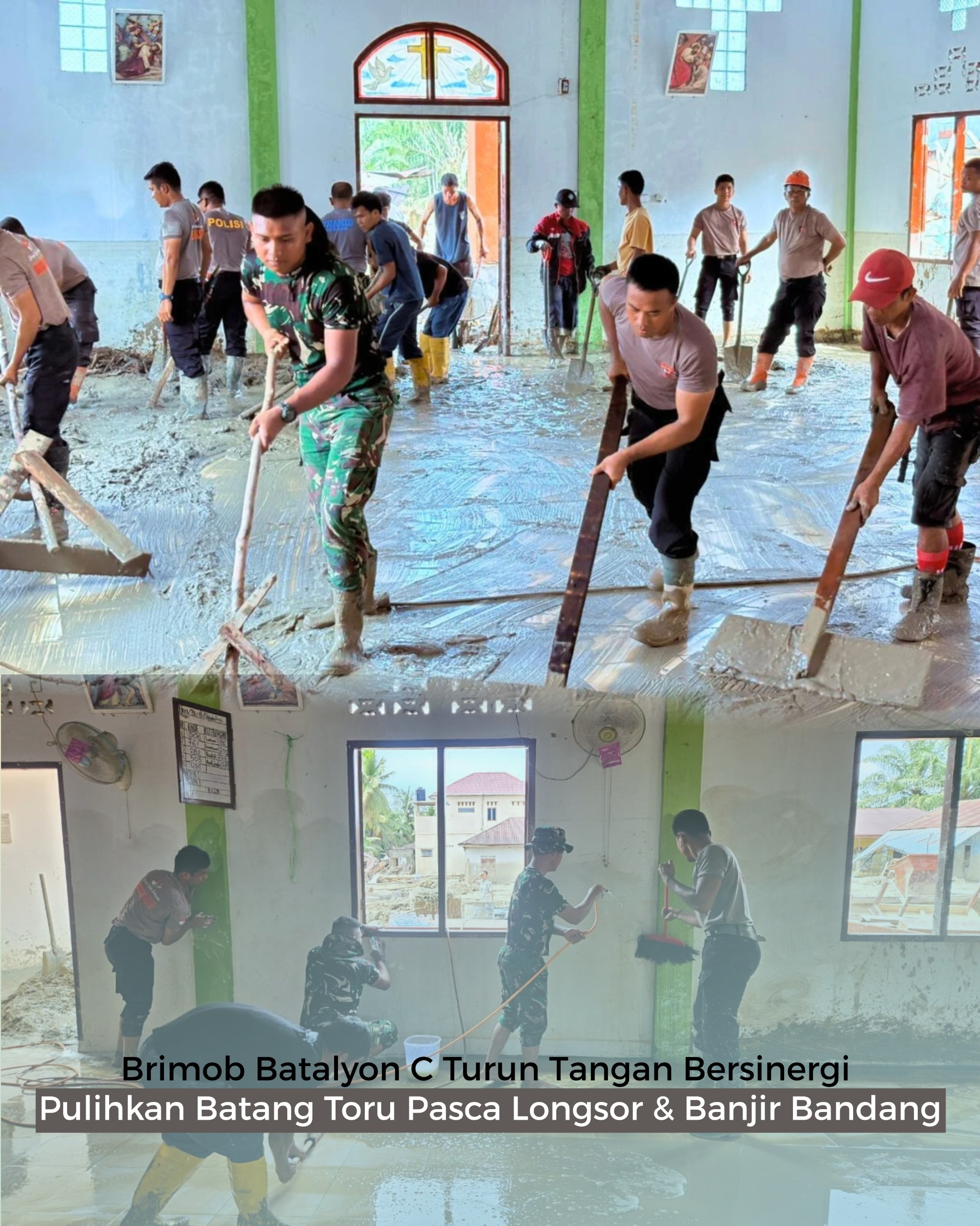 Hari ini, Senin (08/12/2025), Tim Posko 1 Brimob yang dipimpin IPDA Andrico P. Sembiring, S.H. bergerak melakukan pembersihan di berbagai fasilitas umum dan rumah warga di sekitar Desa Aek Ngadol.
