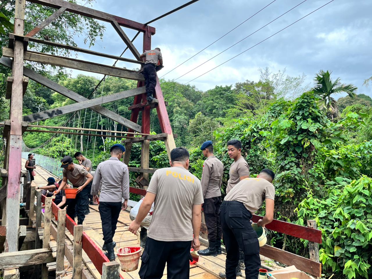 Personel Batalyon C Pelopor Satbrimob Polda Kalimantan Selatan yang dipimpin PS Komandan Kompi 4, Ipda Gusti Komang Eka Semara Bawa, S.H., bersama personel Polres Tabalong melaksanakan kegiatan gotong royong membantu perbaikan berupa pengecatan Jembatan Gantung Sakuyah di Desa Dambung Raya, Kecamatan Bintang Ara, Kabupaten Tabalong,Senin 16 Maret 2026.