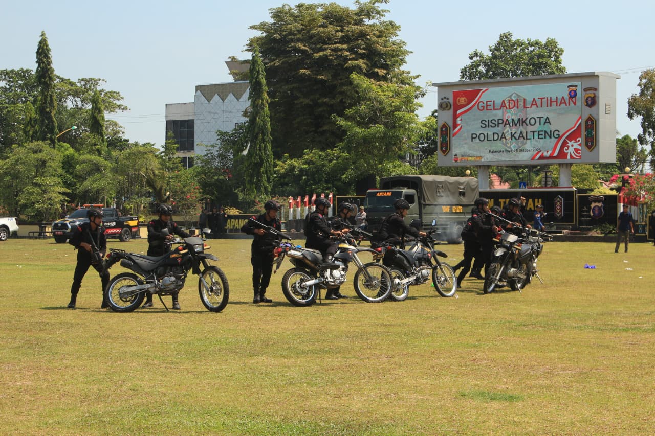 Palangka Raya – Satuan Brimob Polda Kalimantan Tengah bersama jajaran Polda Kalteng mengikuti kegiatan Latihan Sistem Pengamanan Markas (Sispam Mako) yang digelar di Lapangan Barigas Polda Kalteng, Jalan Tjilik Riwut Km.1, Kota Palangka Raya, pada Kamis (16/10/2025).