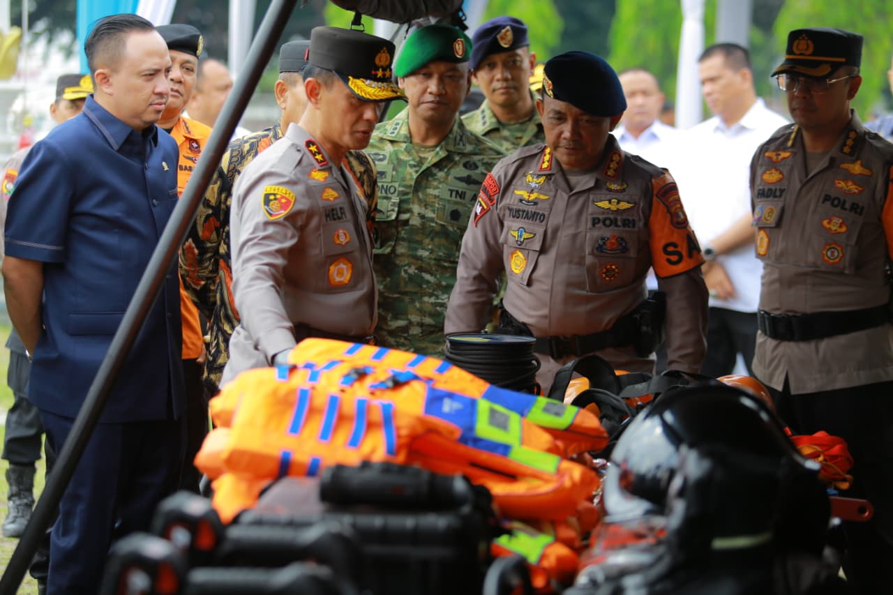 Sebanyak 2 SSK personel Satbrimob Polda Lampung di bawah pimpinan Kombes Pol Yustanto Mujiharso, turut dikerahkan dalam kegiatan tersebut dengan menampilkan kesiapan perlengkapan SAR Darat, SAR Air, Vertical Rescue, serta Satgas Anti Penjarahan. Setelah apel berlangsung, kegiatan dilanjutkan dengan pengecekan gelar perlengkapan dan sesi foto bersama Kapolda Lampung bersama tamu undangan dan peserta apel.