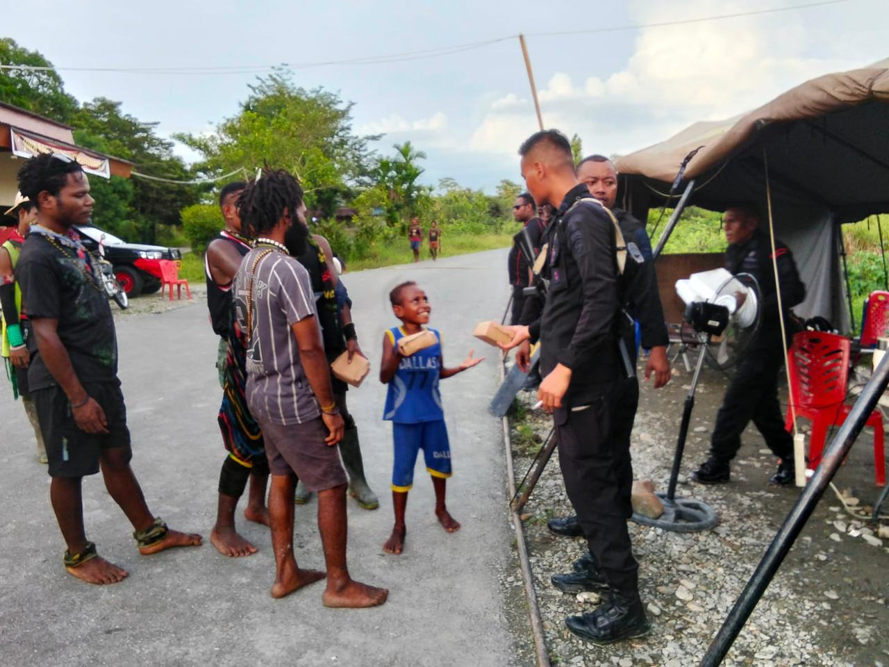 Mimika, 21 Maret 2026 — Personil Brimob Batalyon B Pelopor Pos Kwamki Narama kegiatan Berbagi Makanan Kepada Masyarakat di sekitar Distrik Kwamki Narama, Mimika, Provinsi Papua Tengah.