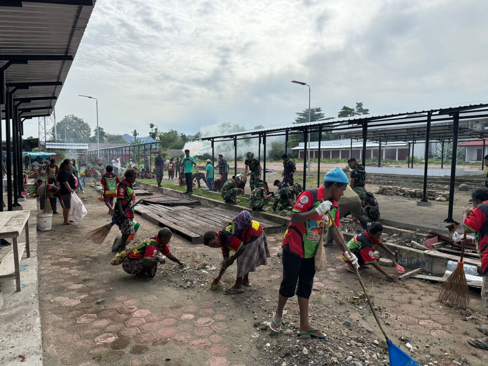 Personil bekerja sama untuk membersihkan area pasar, menyapu jalur pejalan kaki, mengumpulkan sampah yang tersebar, serta membersihkan fasilitas umum. Kolaborasi yang erat antara aparatur dan masyarakat menunjukkan komitmen bersama dalam menjaga kebersihan lingkungan dan menciptakan ruang publik yang nyaman serta sehat untuk digunakan seluruh masyarakat.