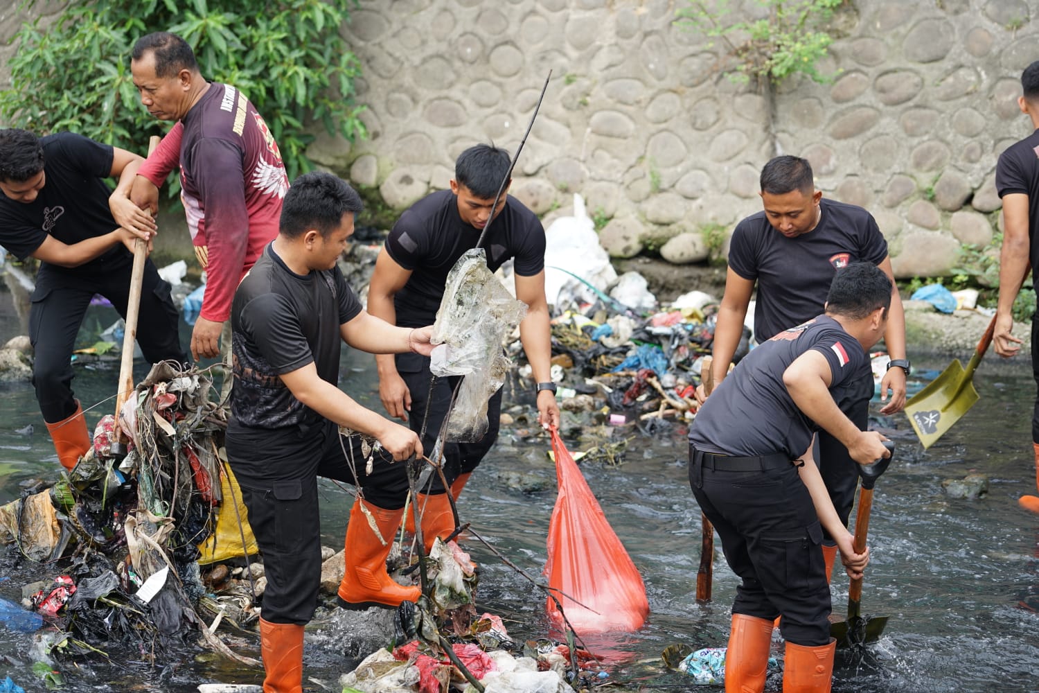 Dengan semangat gotong royong dan pengabdian tanpa pamrih, personel Brimob bahu-membahu membersihkan tumpukan sampah yang mengendap di sekitar aliran sungai. Sampah-sampah yang berpotensi menyumbat aliran air diangkat satu per satu agar sungai kembali bersih, sehat, dan mengalir lancar.