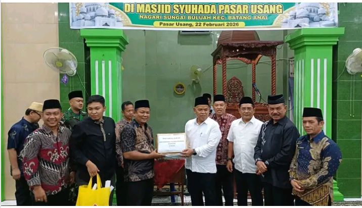 PADANG PARIAMAN | Suasana religius dan penuh kehangatan menyelimuti Masjid Syuhada, Kecamatan Batang Anai, saat Tim Safari Ramadan Pemerintah Provinsi Sumatera Barat melakukan kunjungan silaturahmi, Sabtu malam (22/2/2026). Kehadiran rombongan disambut langsung oleh Bupati Padang Pariaman, JKA, bersama jajaran pemerintah daerah dan tokoh masyarakat setempat.