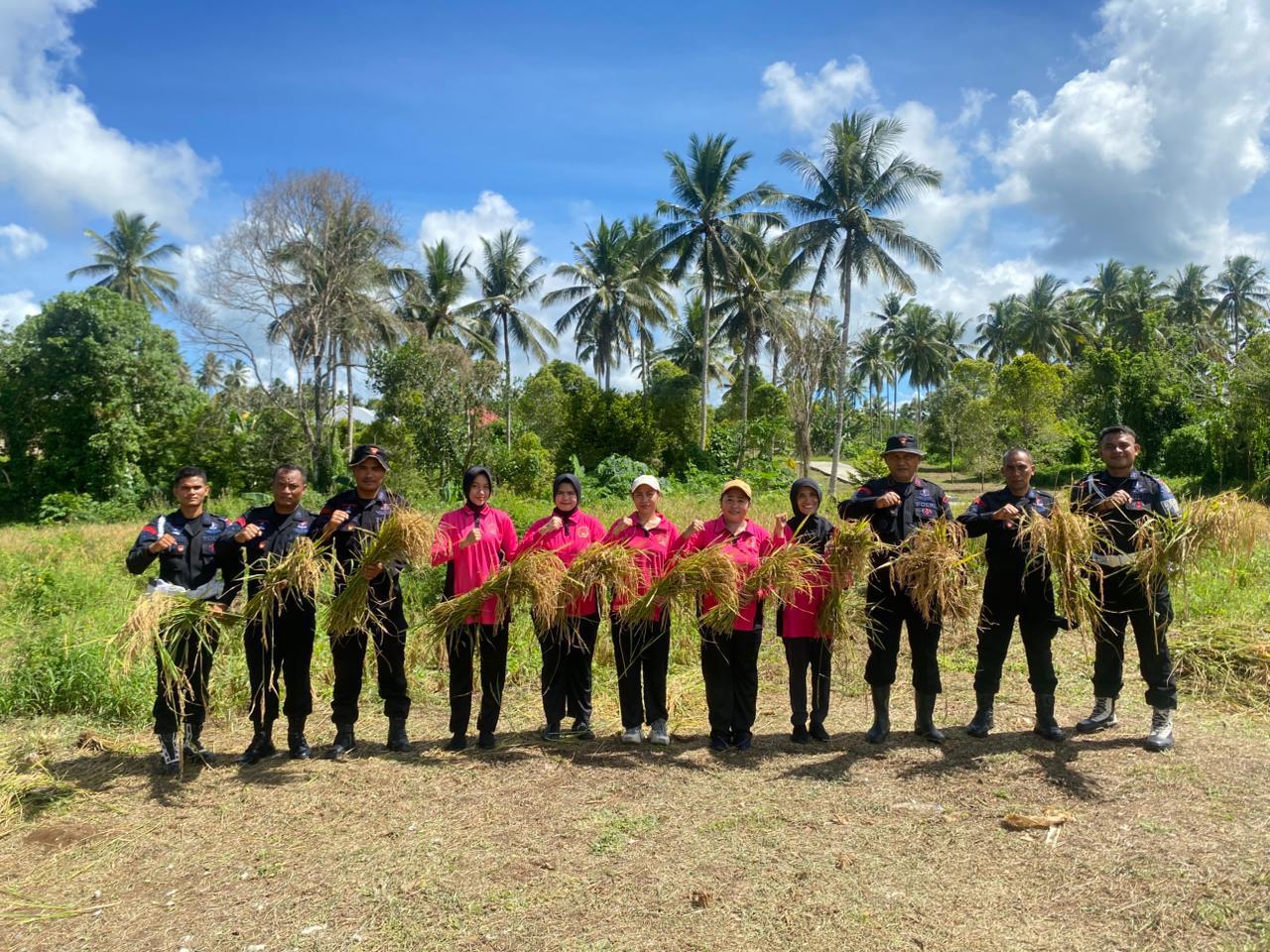 Personel Kompi 4 Batalyon A Pelopor Brimob Malut di bawah pimpinan Iptu Thaifun Badjak melaksanakan kegiatan Panen Raya Padi Gogo di Desa Joubela, Kabupaten Pulau Morotai.