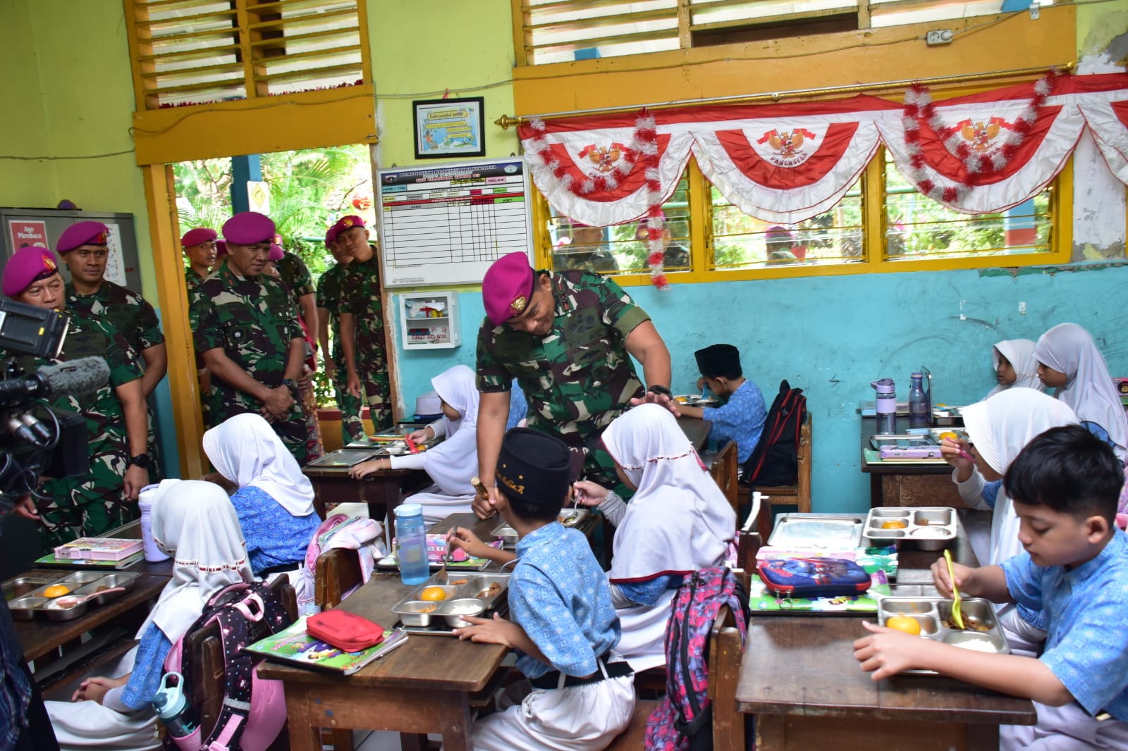 Di SDN 03 Cilandak Timur disela-sela kegiatan membagikan MBG, Dankormar berbincang-bincang serta mengajak siswa untuk berdoa sebelum mulai makan.
