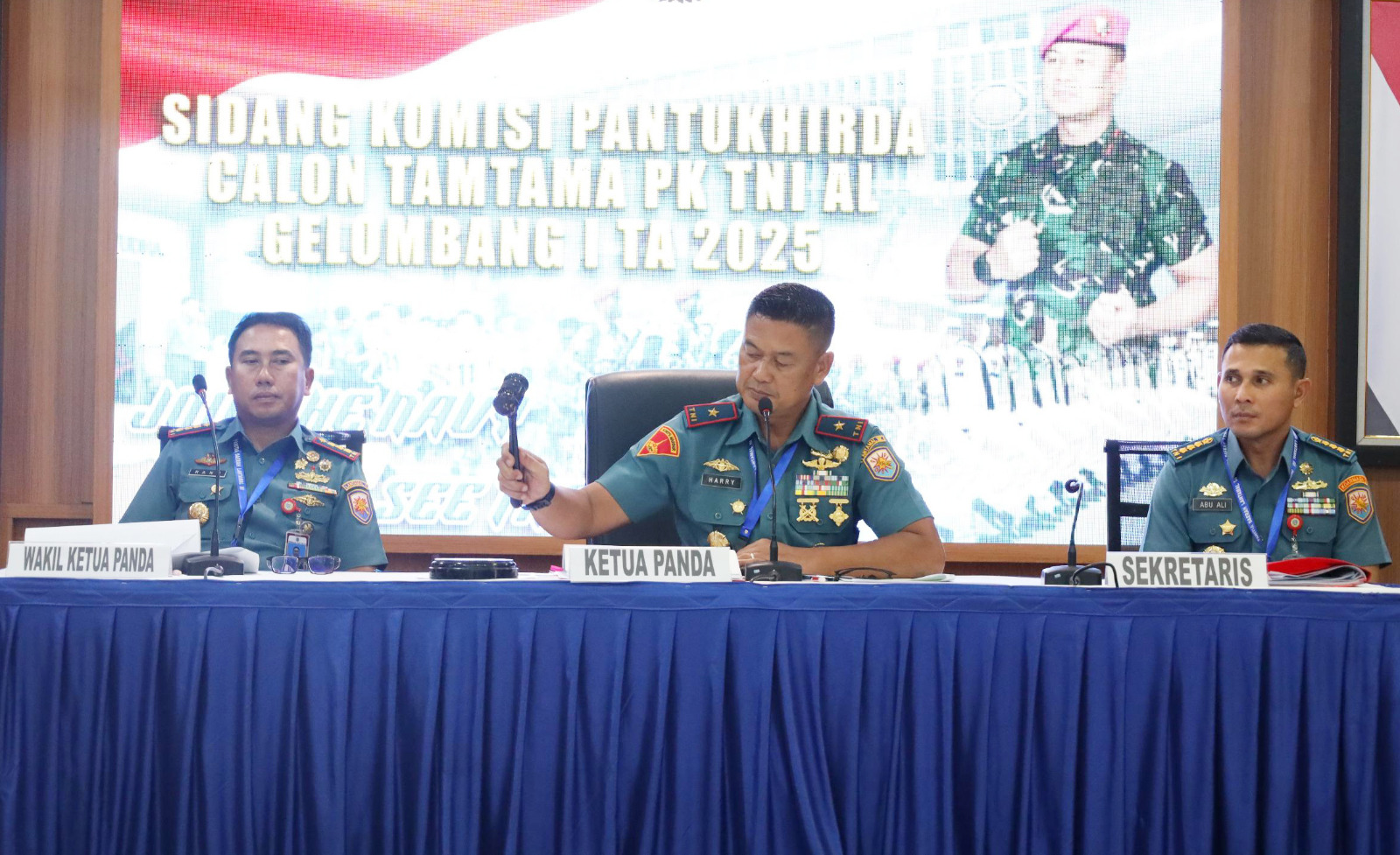 TNI AL-Dispenlantamal3. Komandan Pangkalan Utama TNI Angkatan Laut (Danlantamal) III Jakarta Brigjen TNI (Mar) Harry Indarto, S.E., M.M. selaku Ketua Panitia Daerah (Panda) Lantamal III Jakarta memimpin Sidang Komisi Pemantauan Akhir Daerah (Pantukhirda) Calon Tamtama (Cata) Prajurit Karier (PK) TNI Angkatan Laut Gelombang I TA 2025, bertempat di gedung serbaguna (GSG) Mako Lantamal III Jakarta Jl. Gunung Sahari No. 2, Jakarta Utara, Rabu (05/03/2025).
