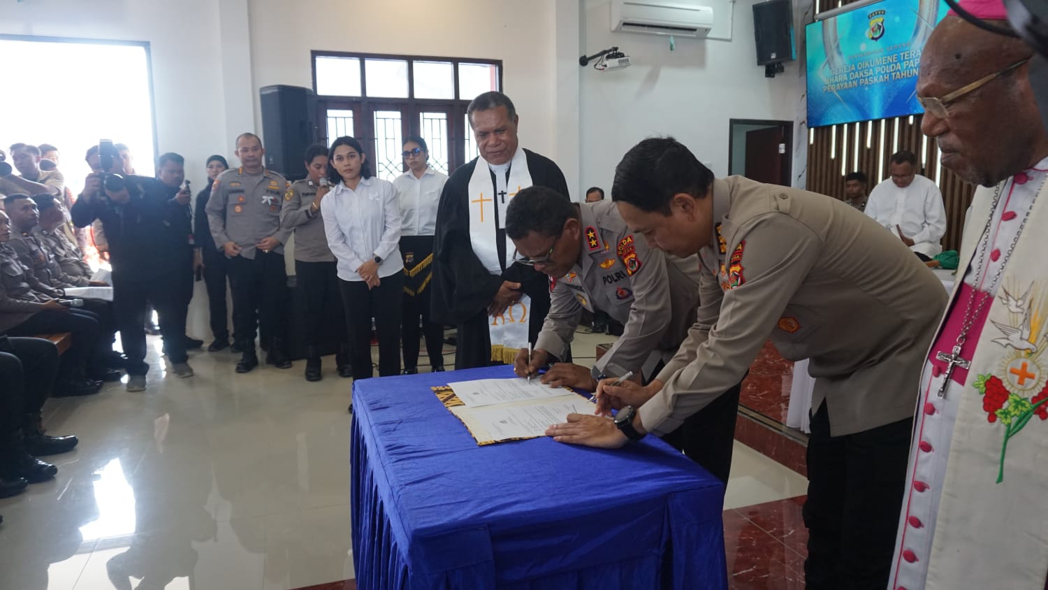 Jayapura – Dansat Brimob Polda Papua turut menghadiri kegiatan Peresmian dan Pentahbisan Gereja Oikumene Terang Bhara Daksa Polda Papua yang berlangsung dengan penuh khidmat dan sukacita. Kegiatan ini menjadi momentum penting dalam memperkuat nilai-nilai keimanan serta kebersamaan di lingkungan Polda Papua.