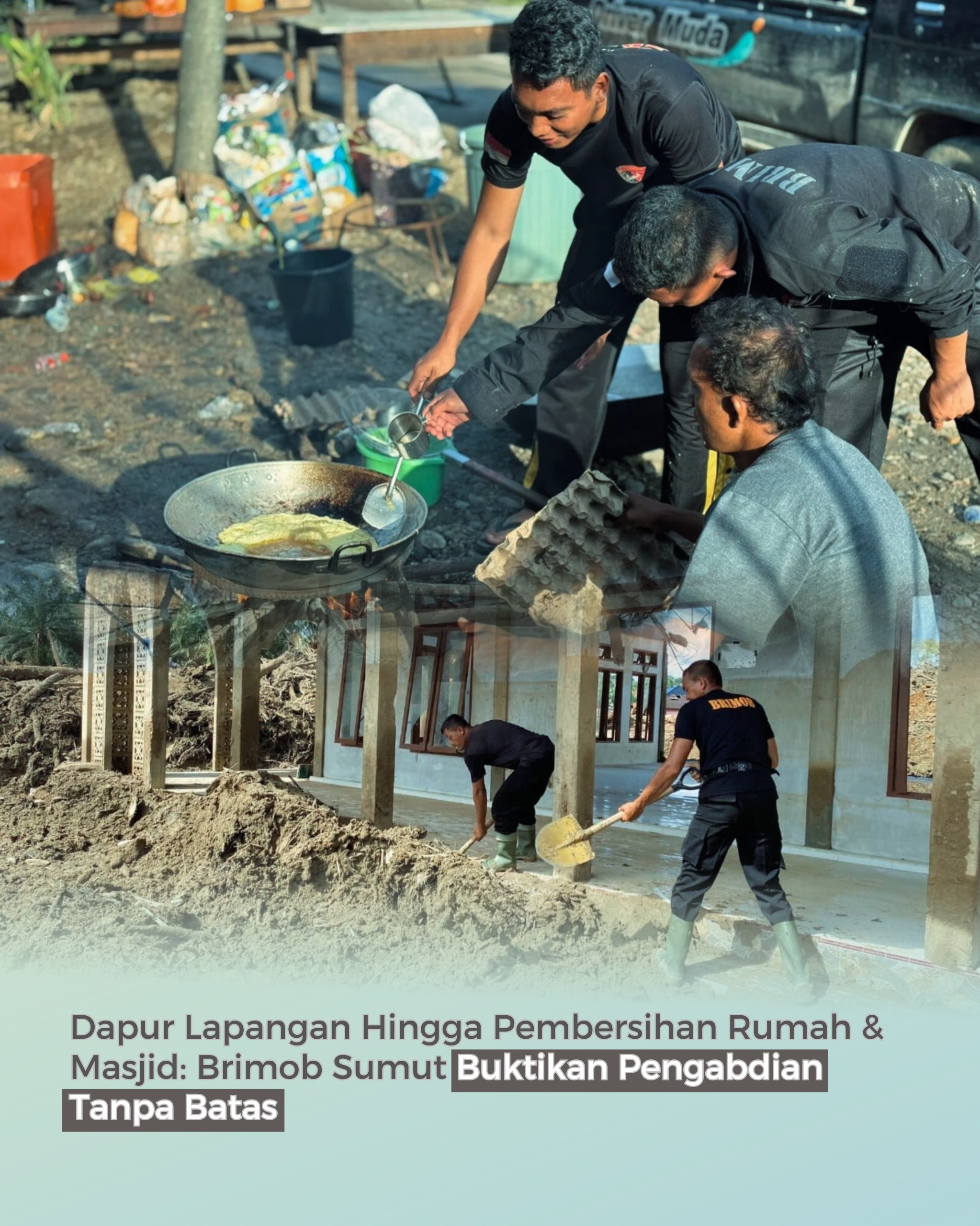 Sejak pagi pasukan Brimob bergerak cepat ke lokasi-lokasi paling parah terdampak banjir bandang dan longsor. Dengan peralatan seadanya di tengah medan sulit, personel tetap berupaya maksimal, mulai dari pembersihan rumah warga, rumah ibadah, hingga membuka dapur lapangan untuk memastikan kebutuhan konsumsi masyarakat tercukupi.
