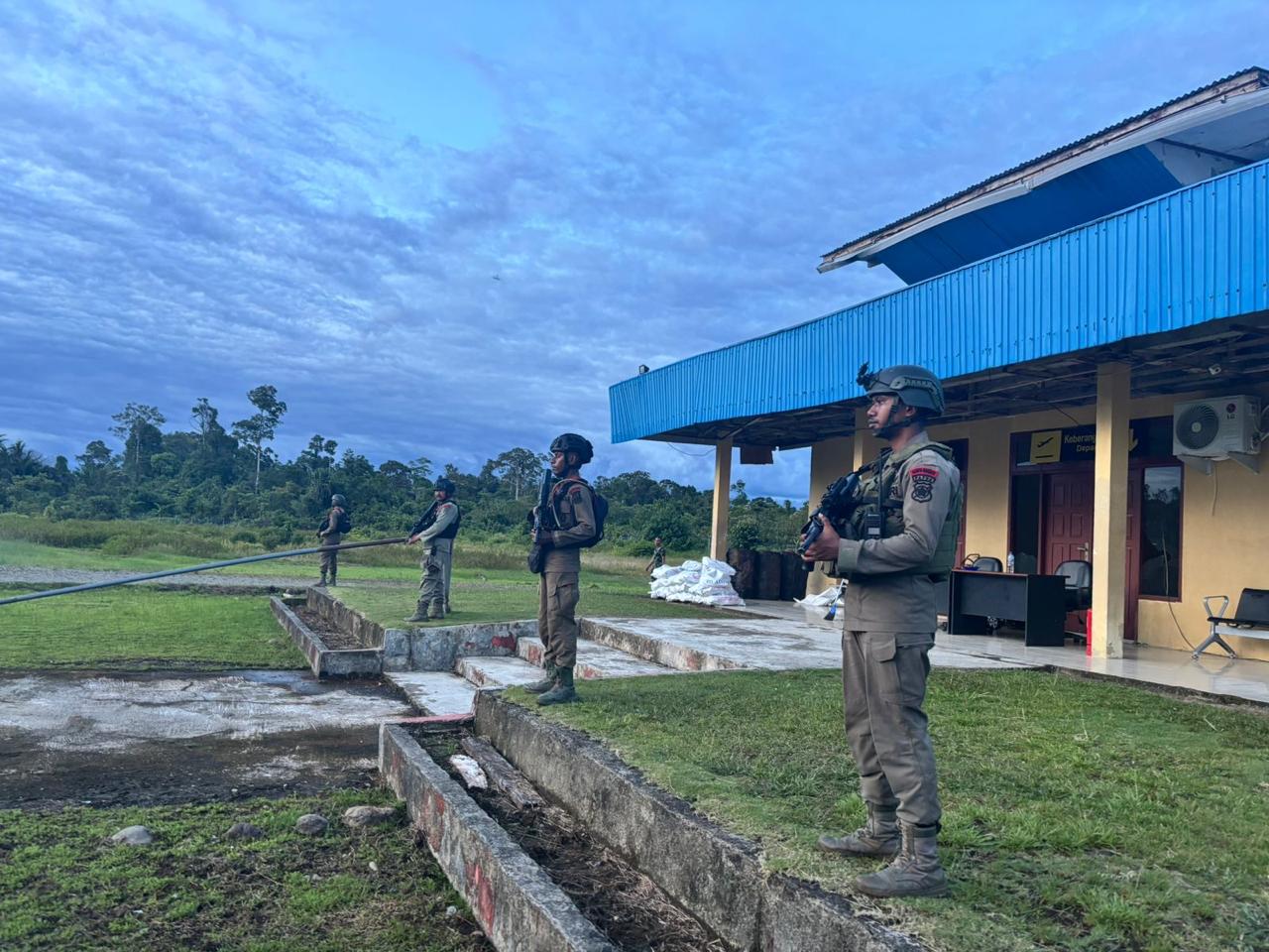 Koroway – Personel Detasemen Gegana Satuan Brimob Polda Papua melaksanakan kegiatan pengamanan di Bandara Koroway, Kabupaten Boven Digoel, dalam rangka kunjungan Marsda TNI Dr. Azhar Aditama Djojosugito beserta rombongan. Kunjungan tersebut dilaksanakan untuk memantau secara langsung situasi dan kondisi keamanan Bandara Koroway pasca terjadinya penembakan terhadap pilot dan co-pilot pesawat milik Smart Air, yang sempat menimbulkan kekhawatiran terhadap stabilitas keamanan di wilayah tersebut.
