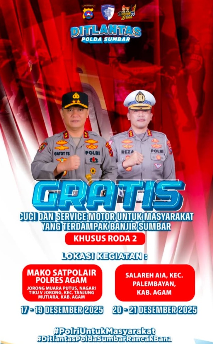 Di tengah kondisi tersebut, kehadiran Polri menjadi harapan tersendiri bagi masyarakat. Menjawab kebutuhan nyata di lapangan, Direktorat Lalu Lintas (Ditlantas) Polda Sumatera Barat menghadirkan langkah konkret berupa layanan cuci dan servis motor gratis bagi warga terdampak banjir.