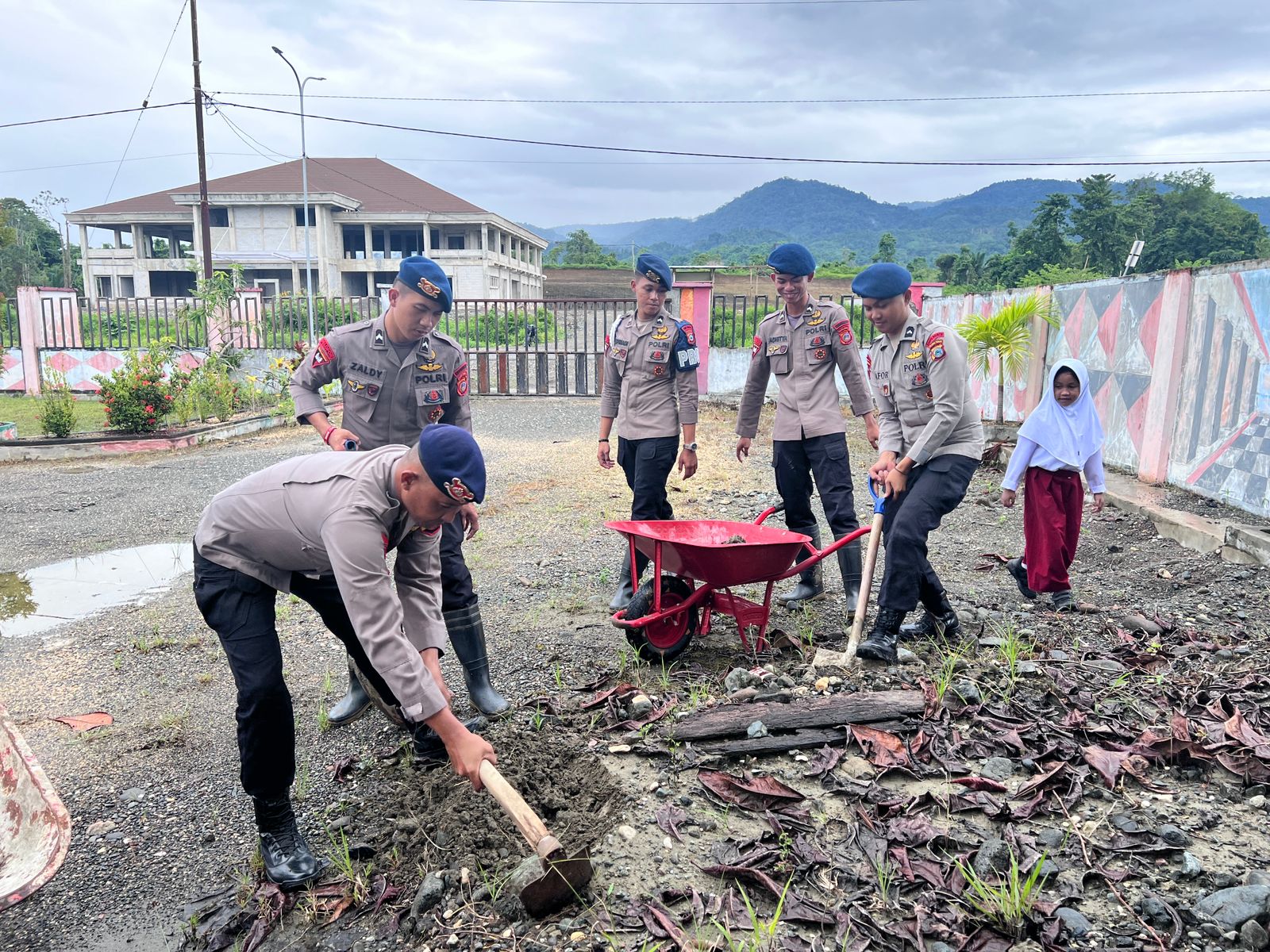 Kegiatan ini difokuskan pada pembersihan lingkungan sekolah, mulai dari halaman, ruang terbuka, hingga area sekitar fasilitas belajar. Personel Brimob tampak bergotong royong bersama pihak sekolah untuk menciptakan lingkungan yang bersih, rapi, dan nyaman bagi para siswa.