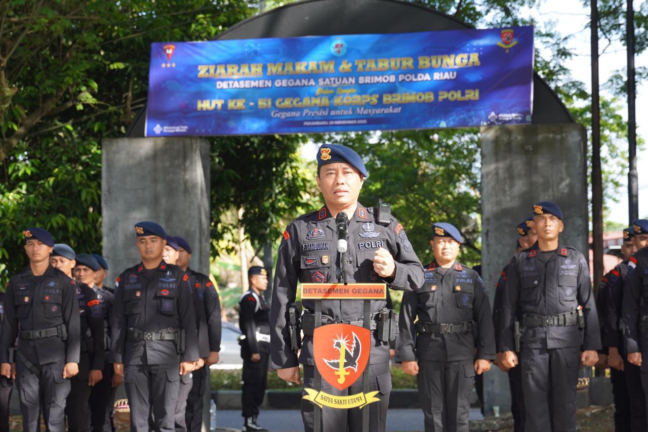 Pekanbaru – Dalam rangka memperingati Hari Ulang Tahun ke-51 Gegana Korps Brimob Polri yang mengusung tema “Gegana Presisi untuk Masyarakat,” Detasemen Gegana Sat Brimob Polda Riau melaksanakan Ziarah Makam dan Tabur Bunga di Taman Makam Bahagia Kusuma Dharma, Jl. Patimura, Pekanbaru