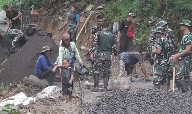 Sambil menggandeng cucu tercintanya, Lukas (4), Ibu Iya berjalan kaki pulang dari sawah menyusuri jalan yang tengah dalam proses pengecoran. Di tengah deru mesin dan kesibukan para prajurit, ia memberanikan diri menyapa salah satu anggota Satgas, Koptu Agus Suryatno.