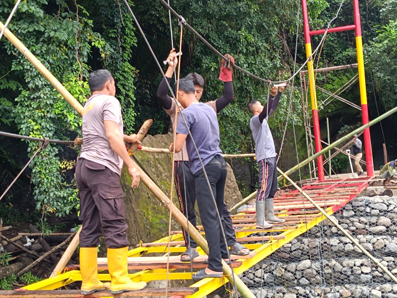 Pada tahap lanjutan ini, personel melaksanakan pemasangan tali sling jembatan yang menjadi komponen vital dalam konstruksi jembatan penghubung antarwilayah tersebut. Pemasangan tali sling dilakukan secara teliti dan penuh kehati-hatian guna memastikan kekuatan serta keamanan jembatan sebelum dapat digunakan oleh warga.