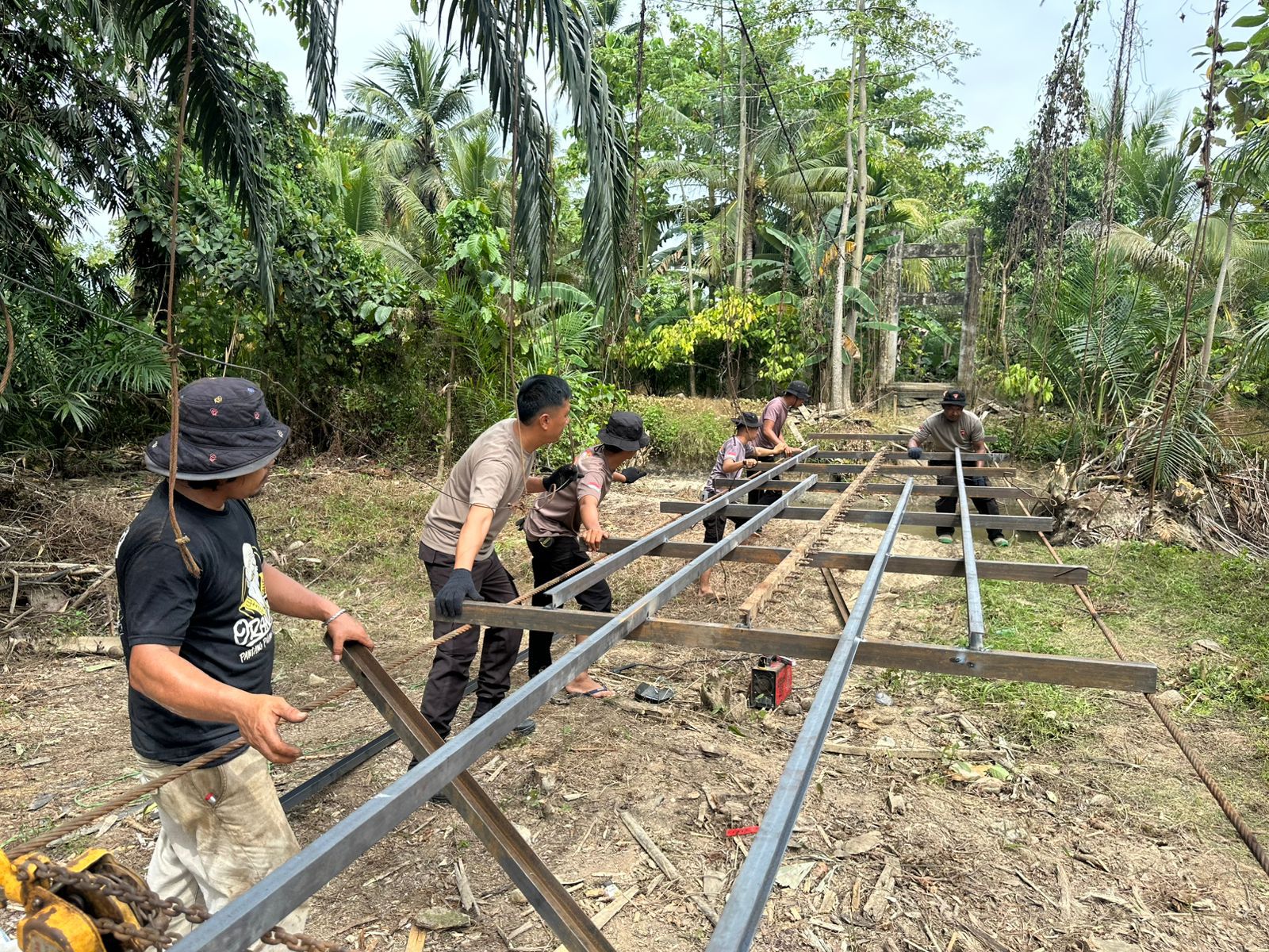 Kegiatan tersebut dilaksanakan secara gotong royong dengan melibatkan anggota Polres Luwu Utara dan Batalyon D Pelopor Satuan Brimob Polda Sulsel yang bekerja sejak pagi hari. Proses pemasangan besi rangka jembatan dilakukan dengan cermat guna memastikan kekuatan dan keamanan struktur, sementara penarikan kawat jembatan gantung menjadi tahapan krusial dalam menopang lantai jembatan.