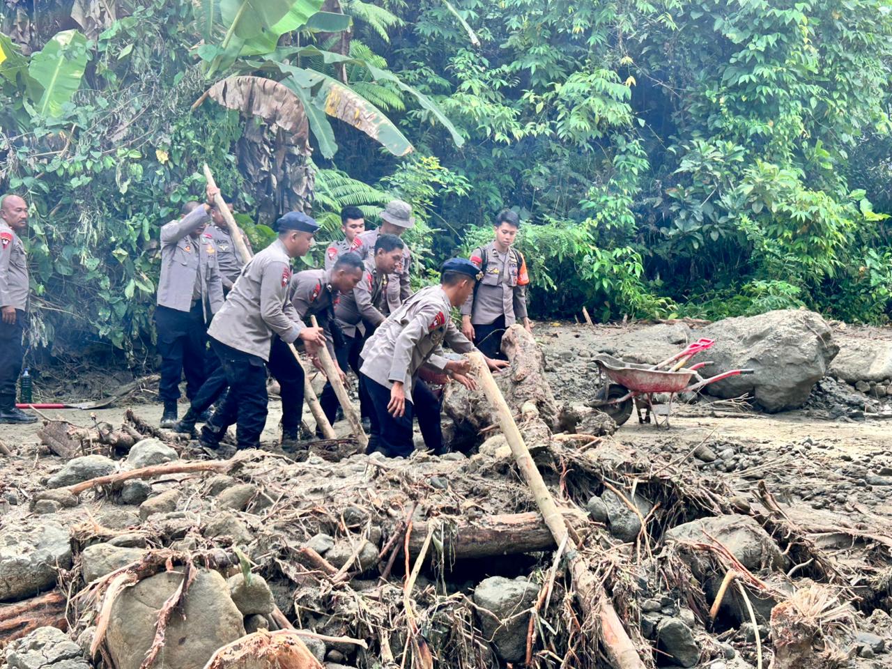 Sejak pagi, personel di lapangan berjibaku melakukan pemotongan dan pembersihan batang-batang pohon besar yang melintang di jalan utama. Evakuasi pohon ini menjadi prioritas agar alat berat serta kendaraan pengangkut logistik bantuan dapat menjangkau titik-titik terdampak di bagian dalam desa yang sebelumnya sulit diakses.
