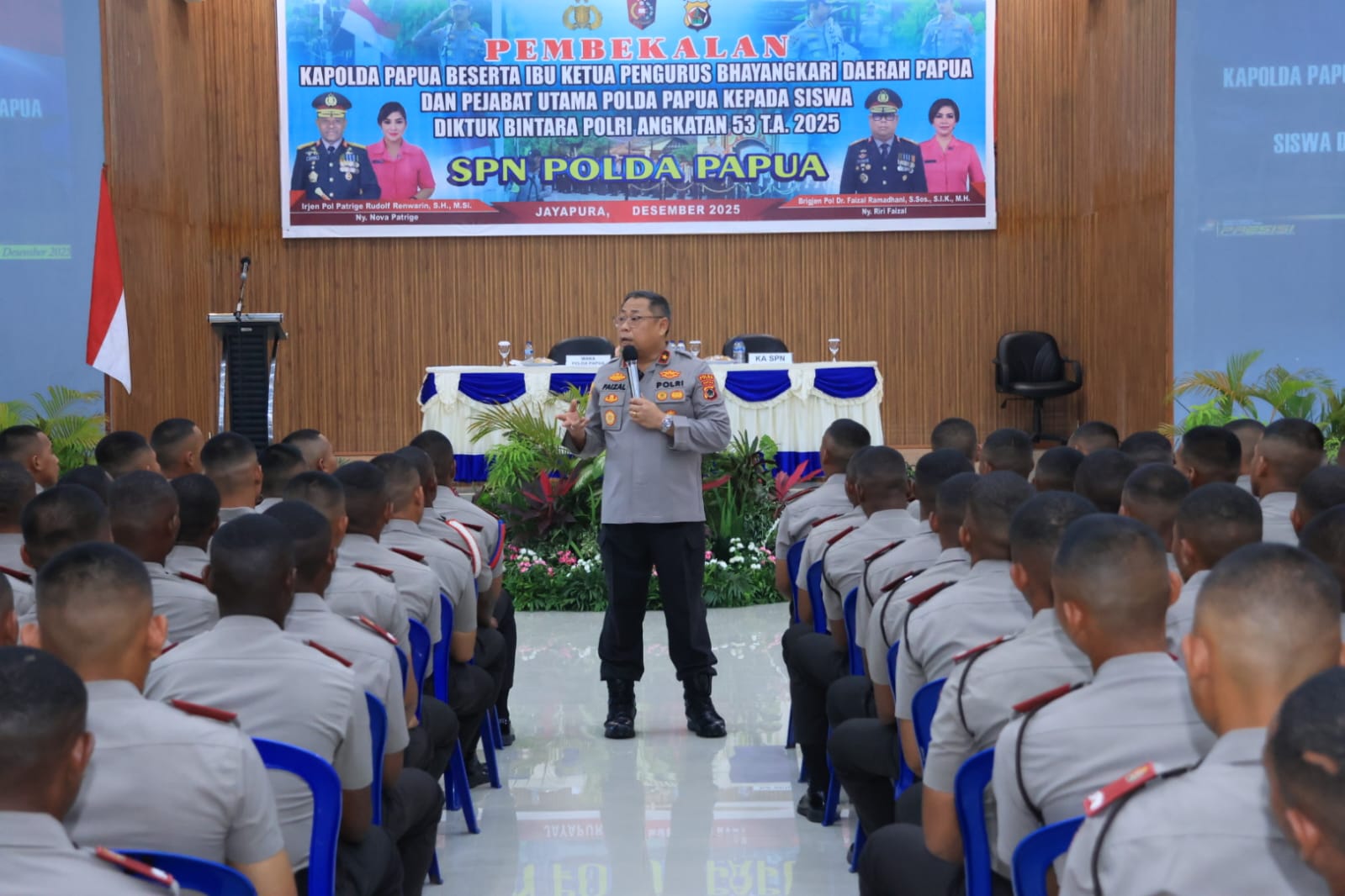 Jayapura – Wakapolda Papua Brigjen Pol. Dr. Faizal Ramdhani, S.Sos., S.I.K., M.H., dan Irwasda Polda Papua Kombes Pol. Jeremias Ronitini, S.I.K., M.Si., memberikan pembekalan kepada Siswa Pendidikan Pembentukan (Diktuk) Bintara Polri Angkatan 53 Tahun Anggaran 2025 di Aula Elsama Numberi, SPN Polda Papua, Selasa (16/12/2025).