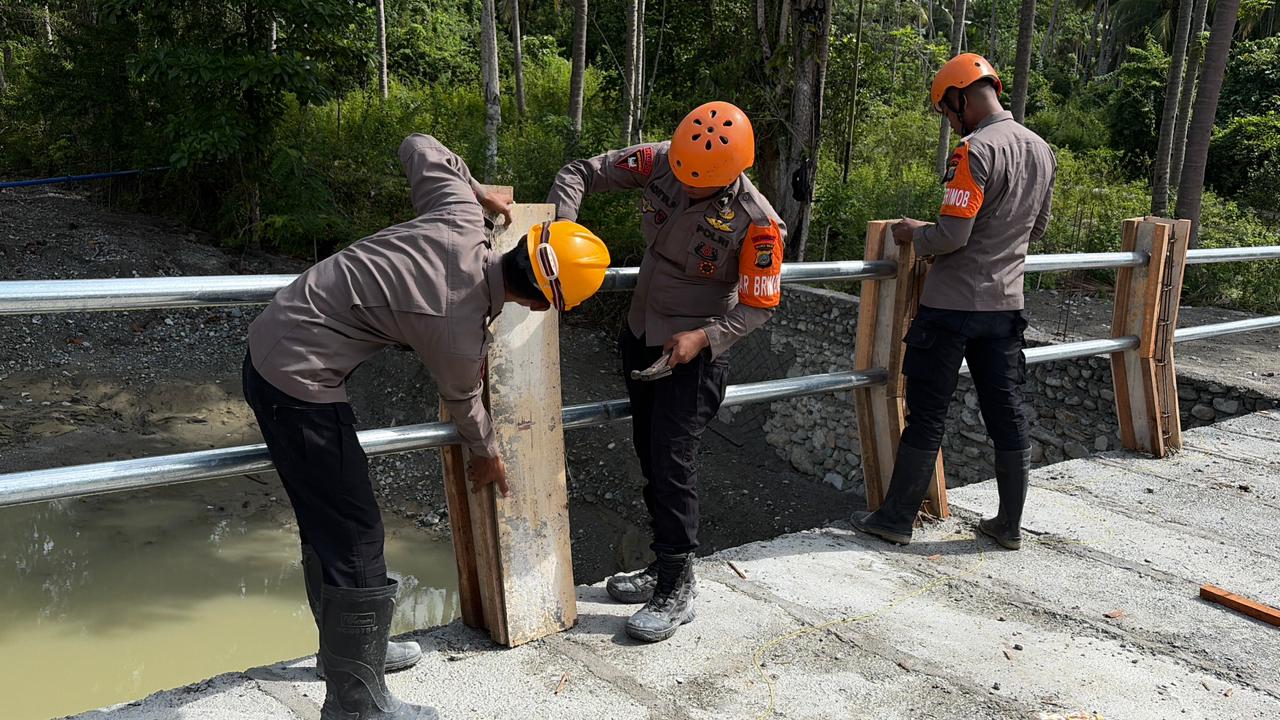 DONGGALA – Memasuki hari ke-43, personel Batalyon A Pelopor Satbrimob Polda Sulteng terus menunjukkan konsistensi dalam pembangunan jembatan di Desa Bale, Kecamatan Tanantovea. Fokus utama pengerjaan hari ini adalah memperkuat fitur keamanan jembatan melalui pengecoran tiang railing serta melanjutkan plesteran pada talud jembatan, Rabu (11/03).
