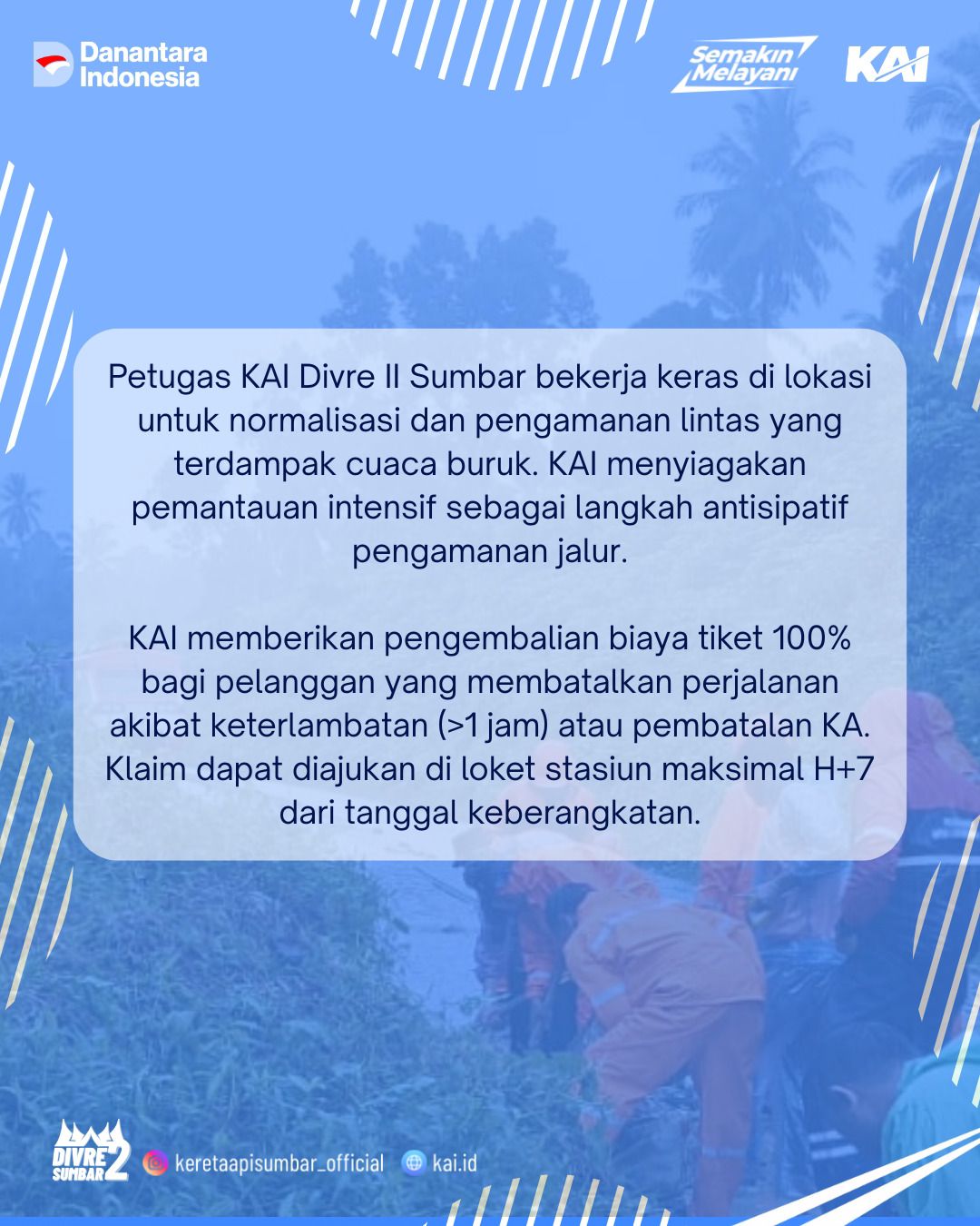 KAI mengimbau pelanggan untuk terus mengikuti informasi terbaru melalui Contact Center 121, WhatsApp 0811-222-33-121, email cs@kai.id, serta akun media sosial resmi @keretaapisumbar_official dan @KAI121.