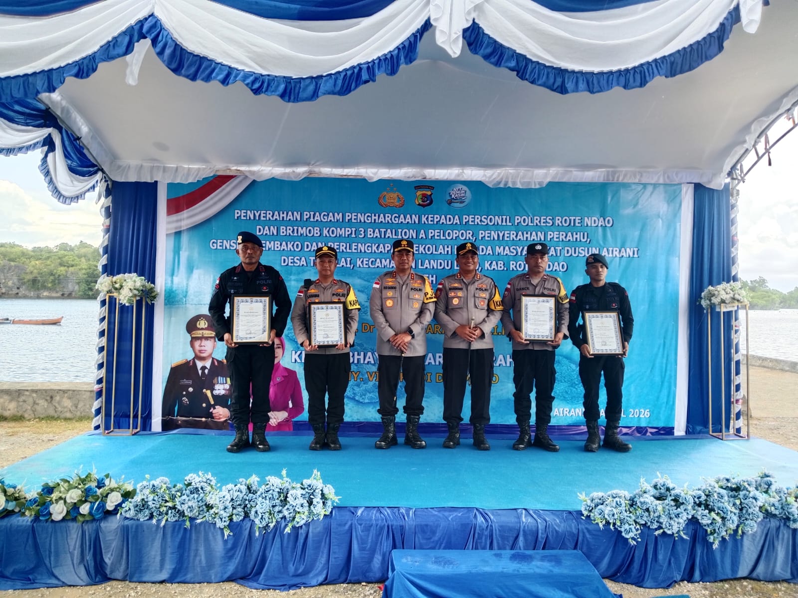 Rote Ndao β Kapolda NTT Irjen Pol. Dr. Rudi Darmoko, S.I.K., M.Si., memberikan penghargaan kepada personel Kompi 3 Batalyon A Pelopor dan anggota Polres Rote Ndao atas aksi penyelamatan paus yang terdampar di perairan Rote Ndao.