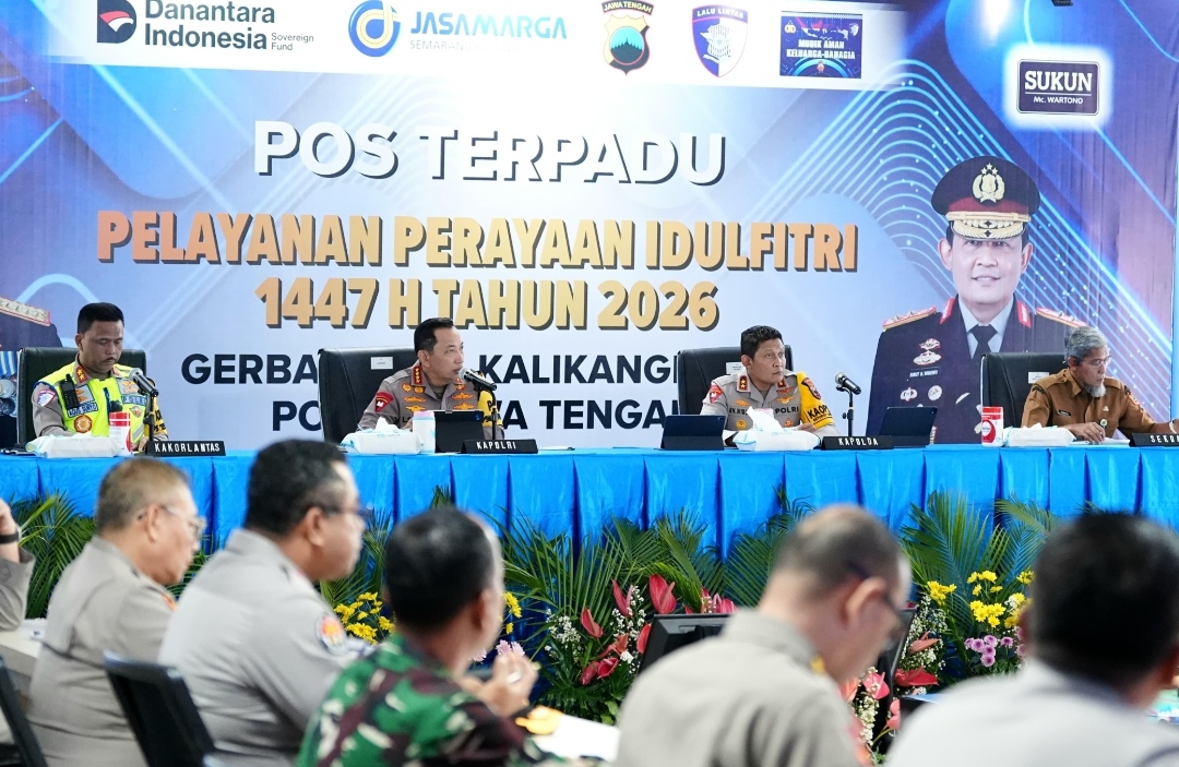 Polda Jateng-Kota Semarang | Kapolri Jenderal Polisi Listyo Sigit Prabowo meninjau Posko Terpadu Gerbang Tol Kalikangkung, Kota Semarang, pada Senin (16/3/2026) sore. Kunjungan tersebut dilakukan untuk memastikan kesiapan jajaran Polda Jawa Tengah bersama seluruh stakeholder dalam menghadapi puncak arus mudik Lebaran 2026.