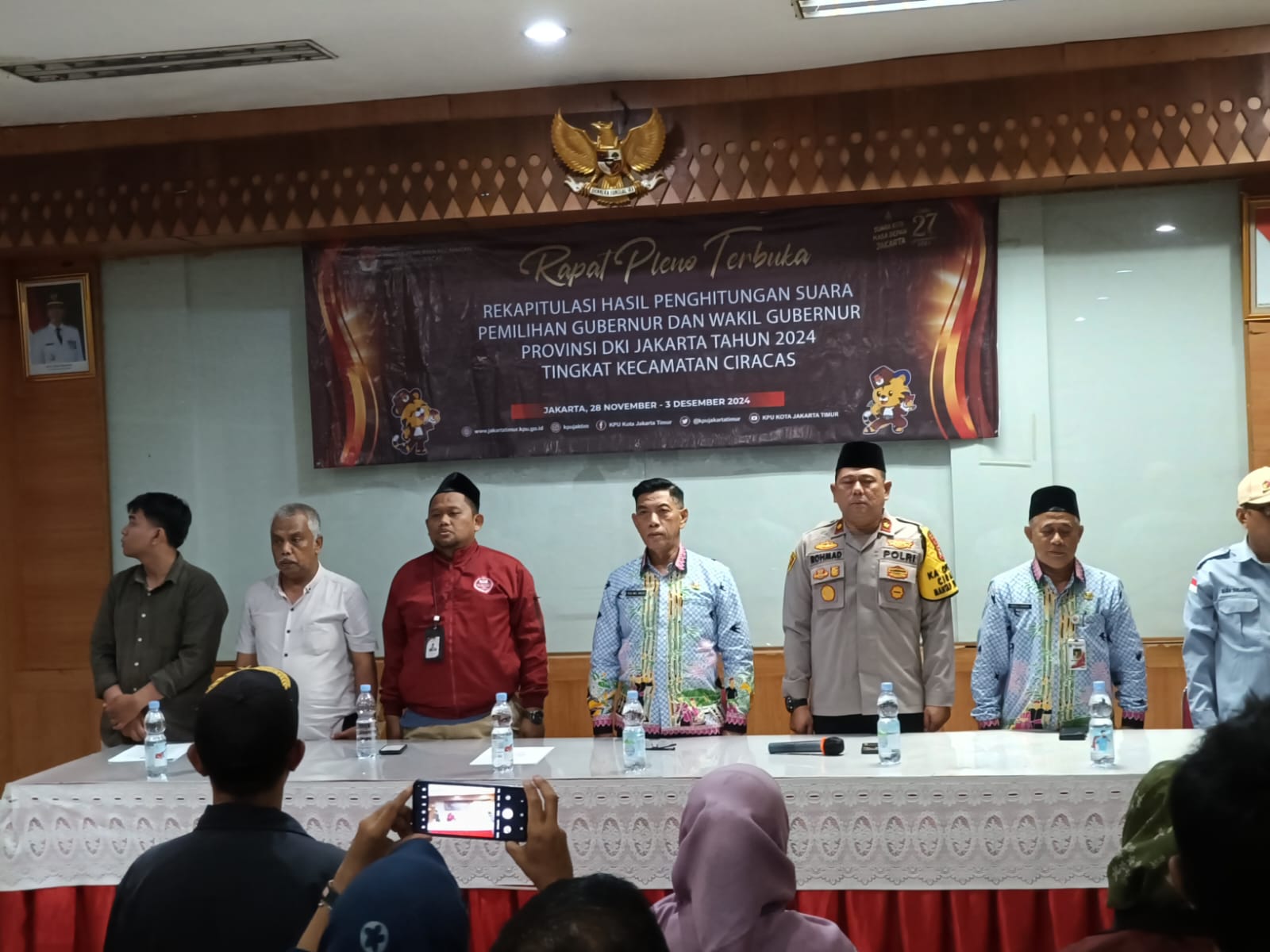JAKARTA – Kapolsek Ciracas, Kompol Rohmad S, S.H., M.H., menghadiri Rapat Pleno Terbuka Rekapitulasi Hasil Penghitungan Suara Pemilihan Gubernur dan Wakil Gubernur DKI Jakarta 2024 tingkat Kecamatan Ciracas.