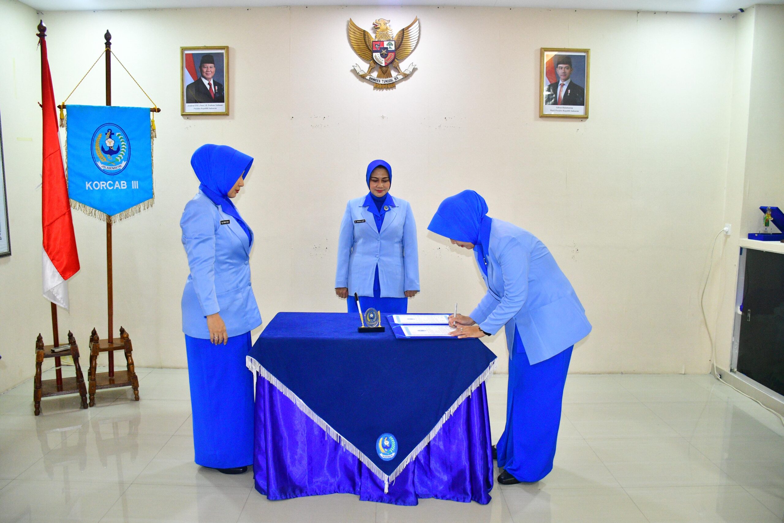 TNI AL-Dispenlantamal3. Ketua Koordinator Cabang (Korcab) III Daerah Jalasenastri Armada (DJA) I Ny. Neneng Harry Indarto memimpin serah terima jabatan (Sertijab) pengurus Korcab III DJA I yakni urusan organisasi dari Ny. Fionna Yovanka kepada Ny. Atika Ahmad dan Sekretaris dari Ny. Tyas Arie Herumurti kepada Ny. Fionna Yovan bertempat di kantor Korcab III DJA I Mako Lantamal III Jakarta Jl. Gunung Sahari No. 2 Ancol, Jakarta Utara, Jumat (27/12/2024).