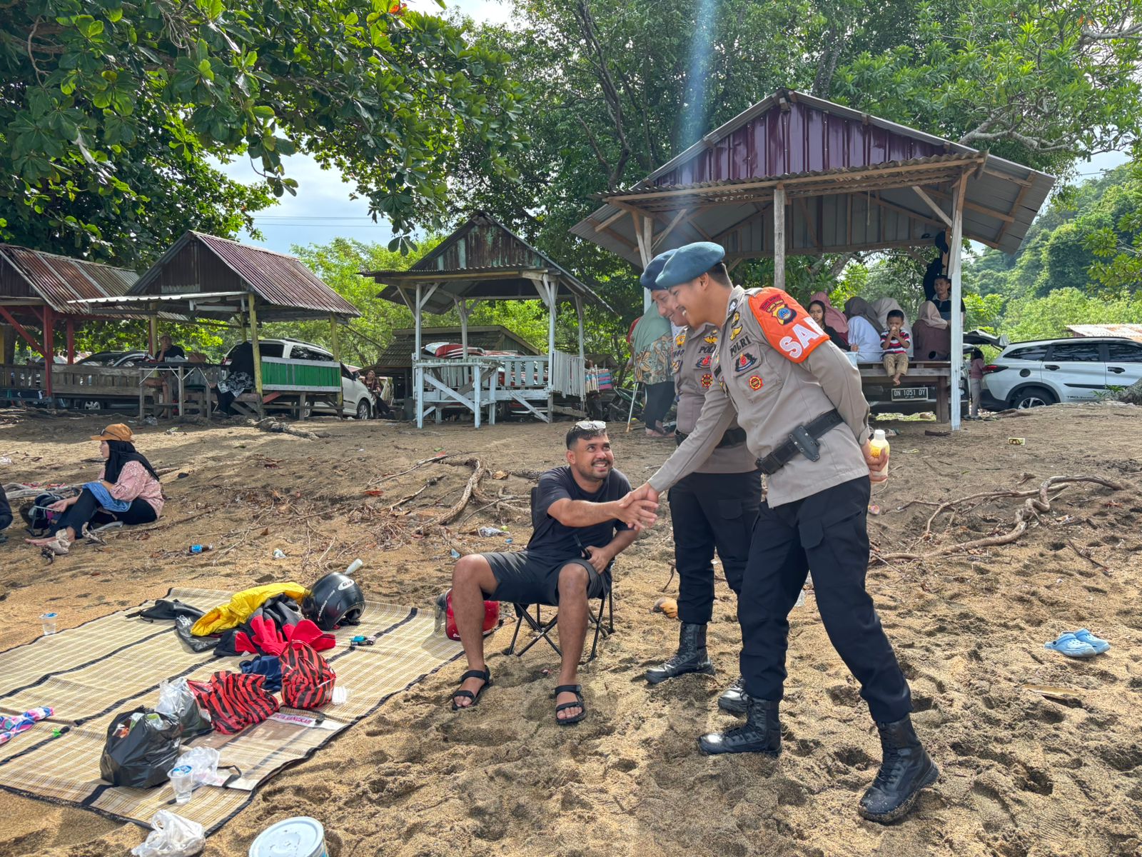 Tidak sekadar berjaga, para personel juga mengedepankan komunikasi dua arah dengan para pengunjung. Melalui dialog yang santai dan humanis, personel menyampaikan imbauan kamtibmas serta mengingatkan para orang tua agar selalu mengawasi anak-anak mereka saat berenang di laut.