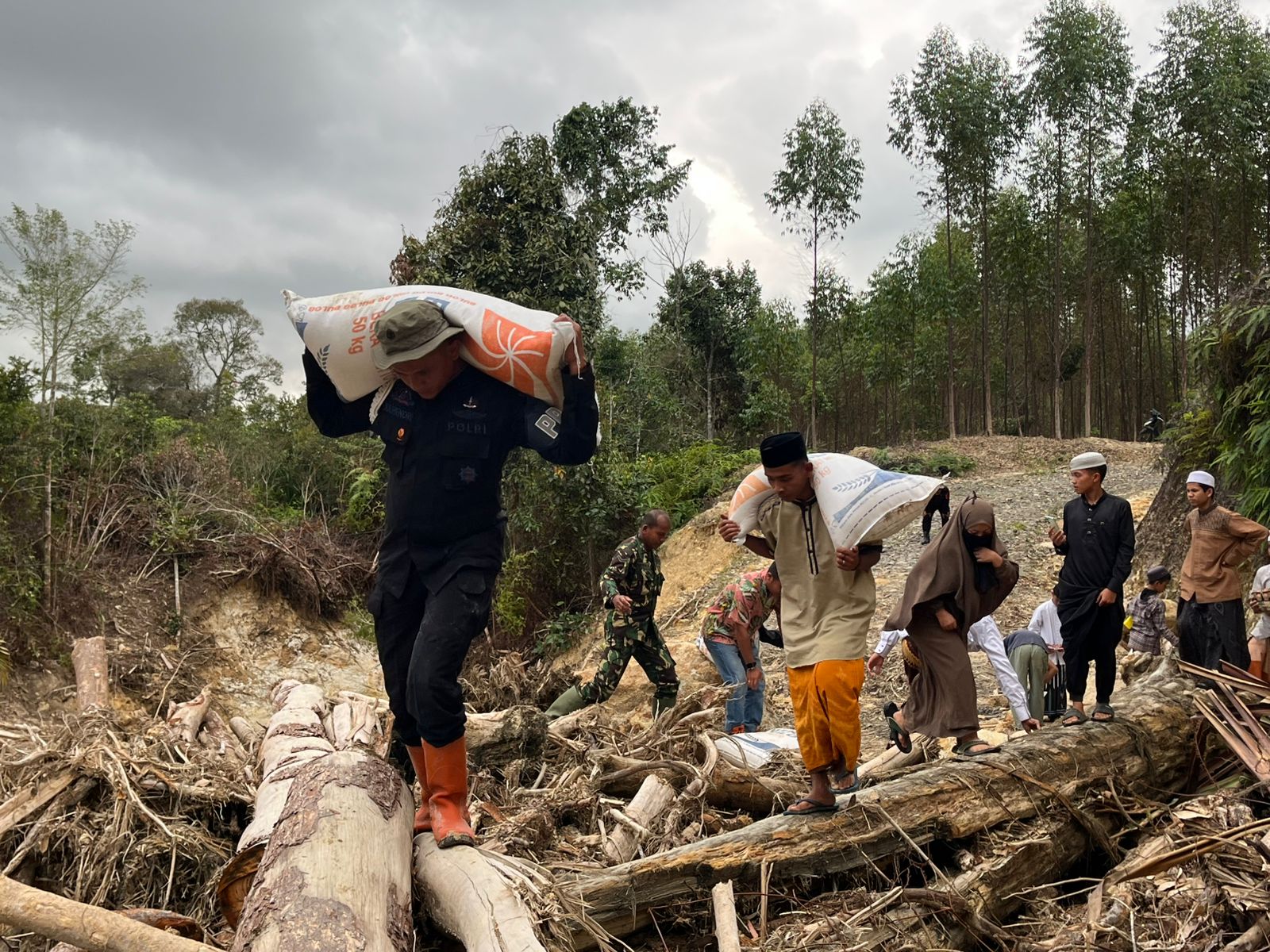Di tengah medan berat dan akses jalan yang terputus akibat longsor, personel Brimob bersama TNI, Polri, dan relawan tetap berkomitmen menyalurkan bantuan sembako kepada Pondok Pesantren Sua Tahfizh Mandiri yang berada di Dusun Aek Latong, Desa Marsada. Kendaraan roda empat yang membawa bantuan terpaksa berhenti sekitar 750 meter dari lokasi pesantren karena tertutup material longsor.