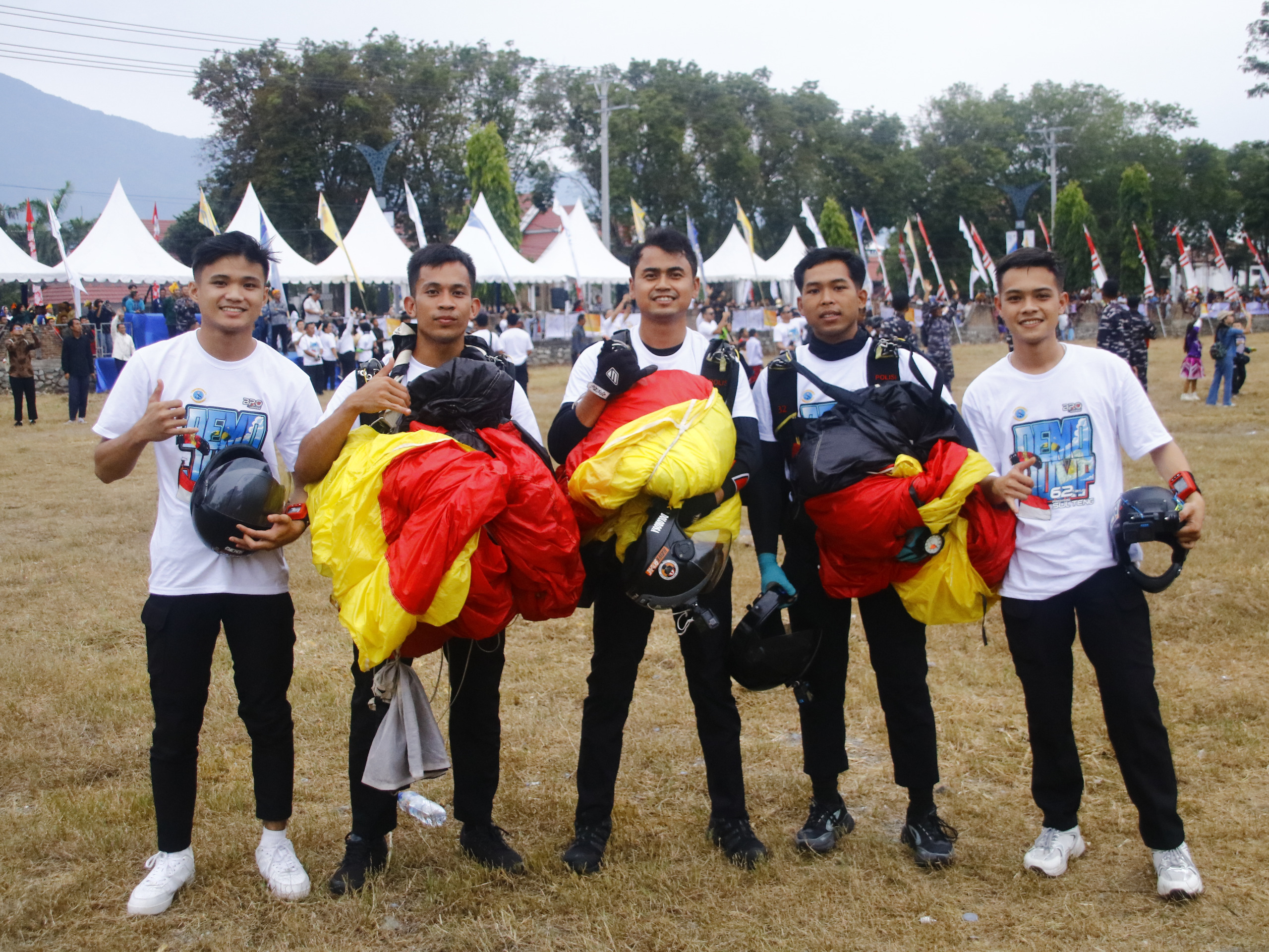 Dalam aksi profesional tersebut, para penerjun tidak hanya menunjukkan keahlian navigasi udara, tetapi juga membawa misi kebanggaan daerah. Di angkasa, nampak berkibar dengan gagah bendera Provinsi Sulawesi Tengah, bendera dari 13 kabupaten dan kota se-Sulteng, serta bendera pihak sponsor yang turut mendukung suksesnya acara ini, Senin (13/04).