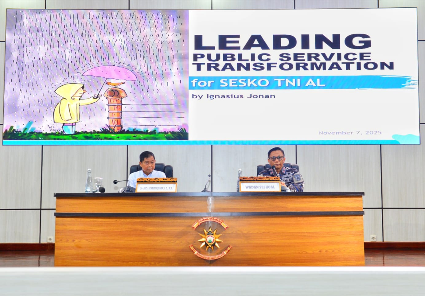 Komandan Sekolah Staf dan Komando Angkatan Laut (Danseskoal) Laksamana Muda TNI Ariantyo Condrowibowo diwakili Wadan Seskoal Laksamana Pertama TNI Dr. Ferry Supriady, S.T., M.M., M.Tr.Opsla., CIQaR menerima kedatangan Bapak Dr. (HC) Drs. Ignasius Jonan, Ak., M.A., dalam rangka memberikan kuliah umum kepada Perwira Siswa Pendidikan Reguler (Pasis Dikreg) Seskoal angkatan ke-64, bertempat di amphiteater gedung Samadikun Seskoal, Cipulir, Jakarta Selatan, Jumat (7/11/2025).