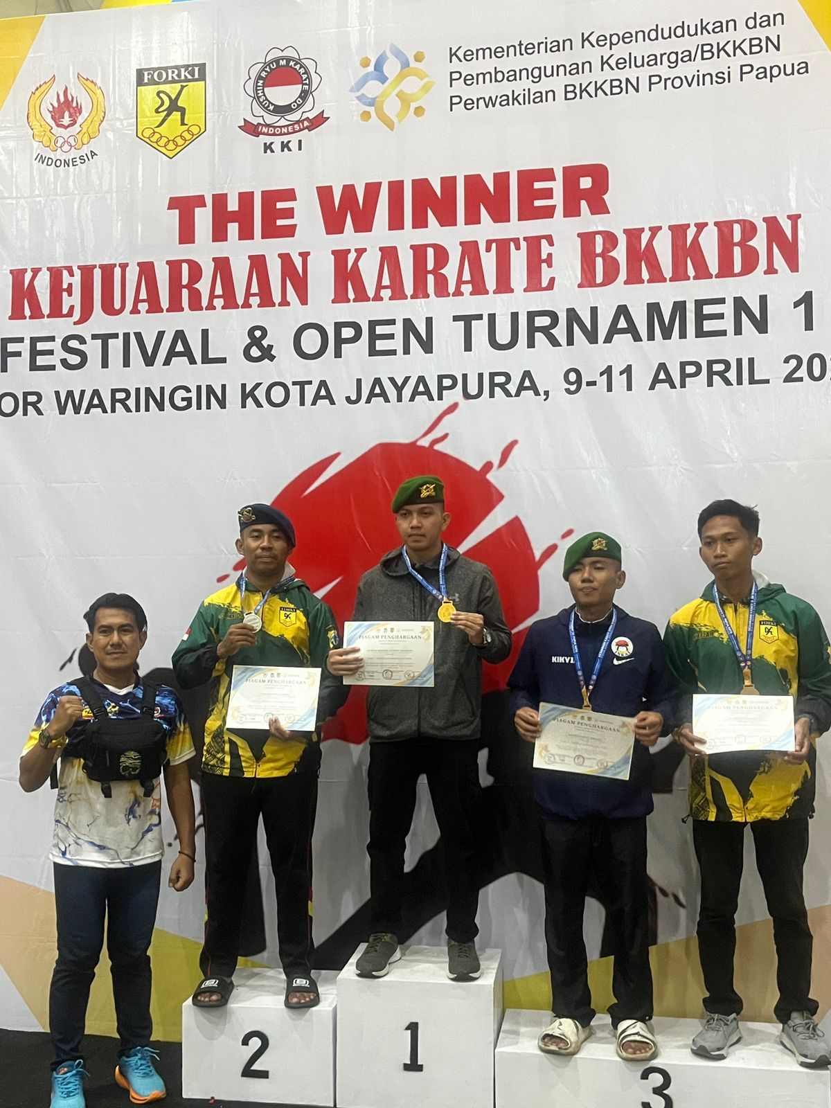 Personel Batalyon A Pelopor Satuan Brimob Polda Papua Tengah, BRIPDA Louis Hezron Pakiding, dalam KEJUARAAN KARATE BKKBN FESTIVAL DAN OPEN TOURNAMENT 1 . Gor Waringin 9-11 April 2026, Kotaraja, Jayapura, Provinsi Papua