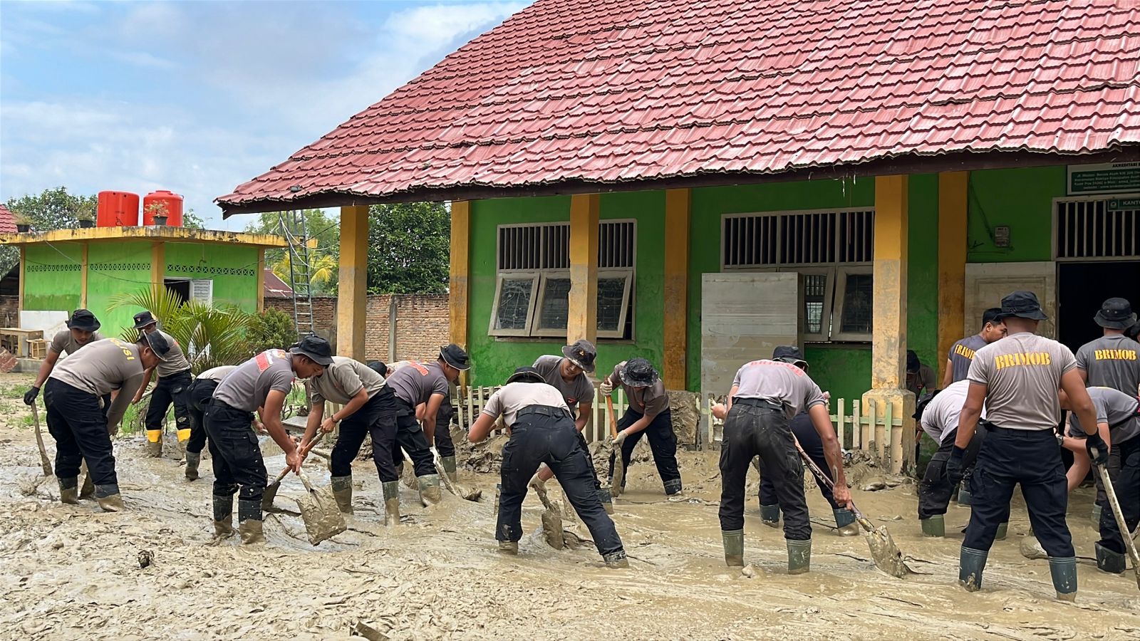 Dengan semangat gotong royong, personel bersama tim gabungan membersihkan sisa lumpur, sampah, serta mengevakuasi material bekas Lumpur yang mengganggu area sekolah. Upaya tersebut dilakukan guna menciptakan lingkungan yang bersih, aman, dan layak bagi para siswa.