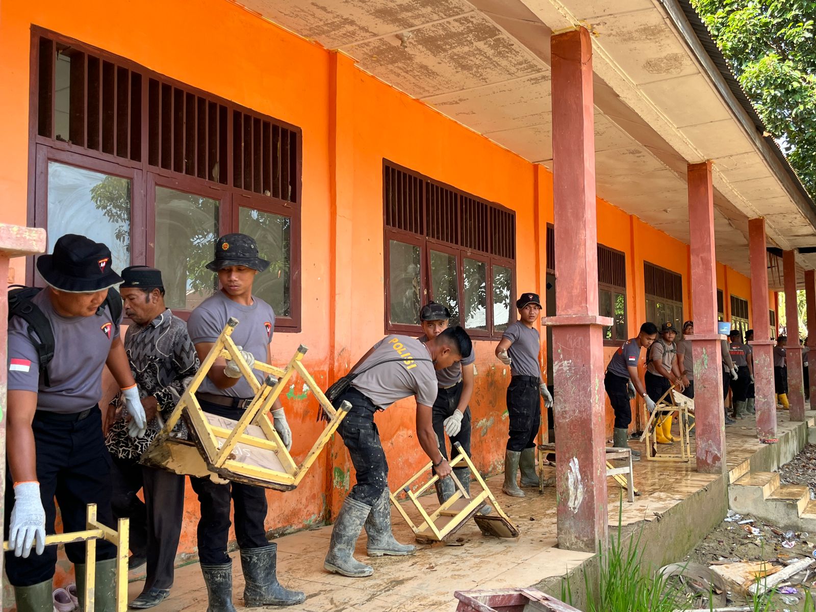 Dengan semangat gotong royong, personel bersama tim gabungan membersihkan sisa lumpur, sampah, serta mengevakuasi material bekas Lumpur yang mengganggu area sekolah. Upaya tersebut dilakukan guna menciptakan lingkungan yang bersih, aman, dan layak bagi para siswa.