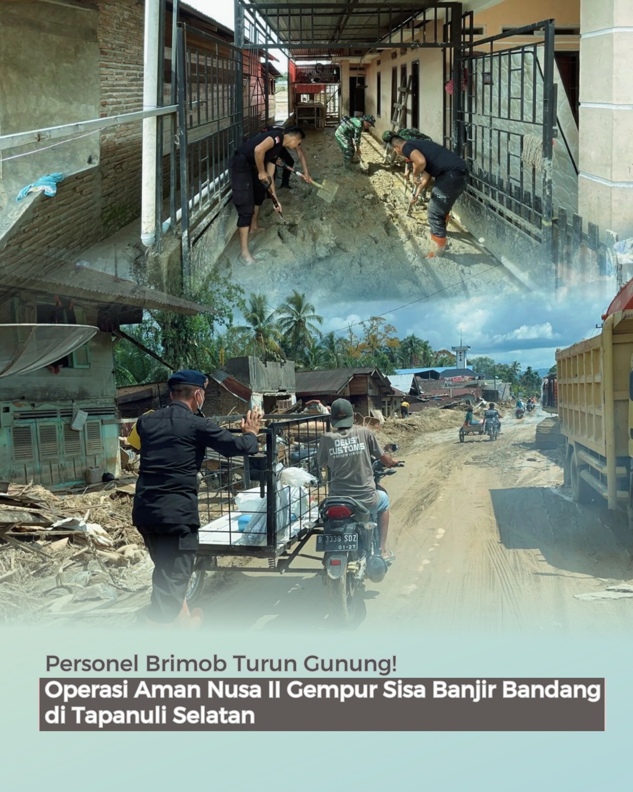 Tapanuli Selatan — Dengan semangat pengabdian tanpa batas, sebanyak 1 Satuan Setingkat Kompi (SSK) personel Satuan Brimob Polda Sumut yang tergabung dalam Operasi Aman Nusa II dikerahkan untuk membantu penanggulangan dan percepatan pemulihan pasca banjir bandang di wilayah Kabupaten Tapanuli Selatan, Sabtu (06/12/2025).