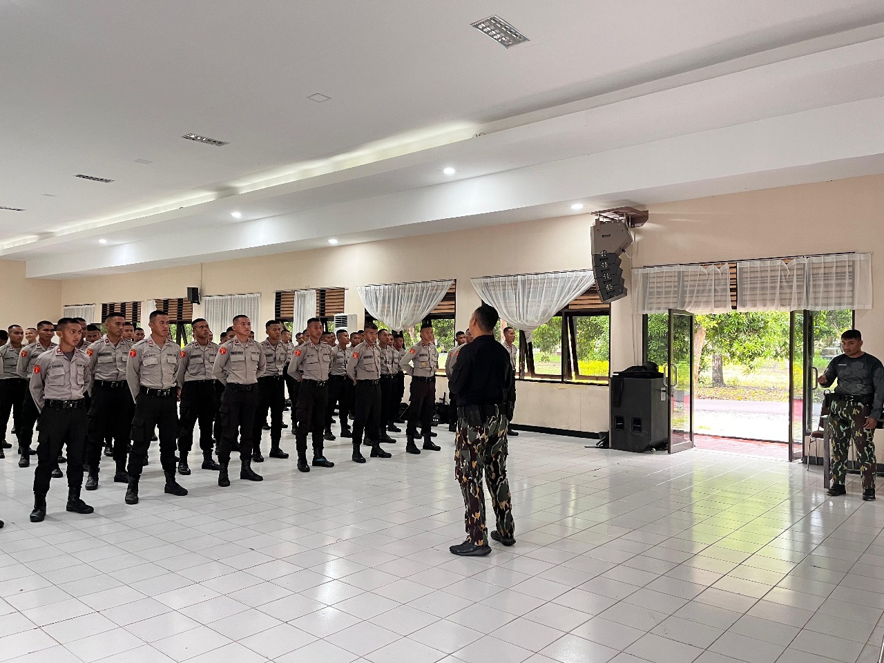 Personel Detasemen Gegana Satbrimob Polda Sulawesi Tengah melaksanakan tugas sebagai instruktur dalam materi Fungsi Teknis Brimob, khususnya Anti Anarkis, bagi para siswa Pendidikan Pembentukan Bintara di SPN Polda Sulteng.