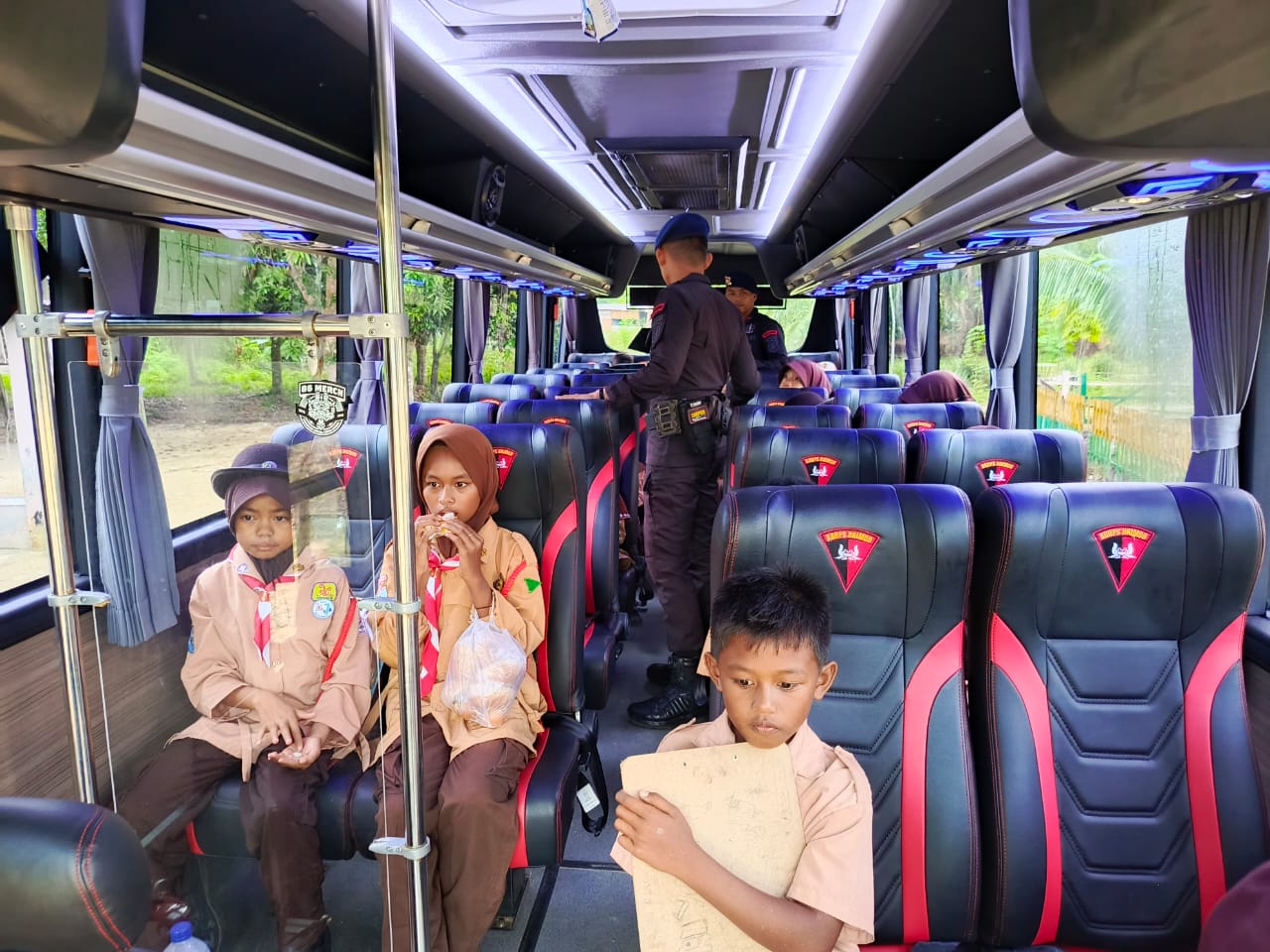 Selain memberikan layanan transportasi, personel Brimob juga berinteraksi langsung dengan para pelajar, memberikan pesan-pesan disiplin, semangat belajar, serta pentingnya menjaga keamanan diri di jalan.