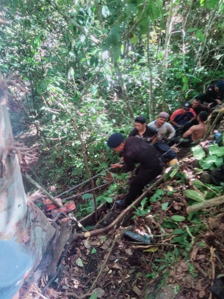 Pelaksanaan evakuasi dilakukan oleh 1 tim Batalyon C Pelopor dipimpin Ipda Doni Ramadyan, S.H., bersama pihak vendor jasa pengiriman dari PT Timur Terang. Langkah awal dimulai dengan penyiapan personel, koordinasi teknis, serta penentuan metode evakuasi di lapangan. Pada Senin (24/11/2025) pukul 20.49 WIB, personel Batalyon C Pelopor melakukan koordinasi lanjutan dengan pihak vendor. Evakuasi bangkai kendaraan dimulai Selasa (25/11/2025) pukul 09.00–16.00 WIB dipimpin Aipda Madiono, dilakukan secara manual menggunakan katrol rantai yang diikat pada pohon dengan kondisi tebing berkemiringan sekitar 45 derajat. Hingga sore hari, progres evakuasi mencapai 20 persen dari titik dasar. Proses dilanjutkan Rabu (26/11/2025), dan kendaraan mulai bergeser hingga 40 persen dari titik awal. Supir kendaraan mengalami luka ringan dan saat ini dalam kondisi sadar.