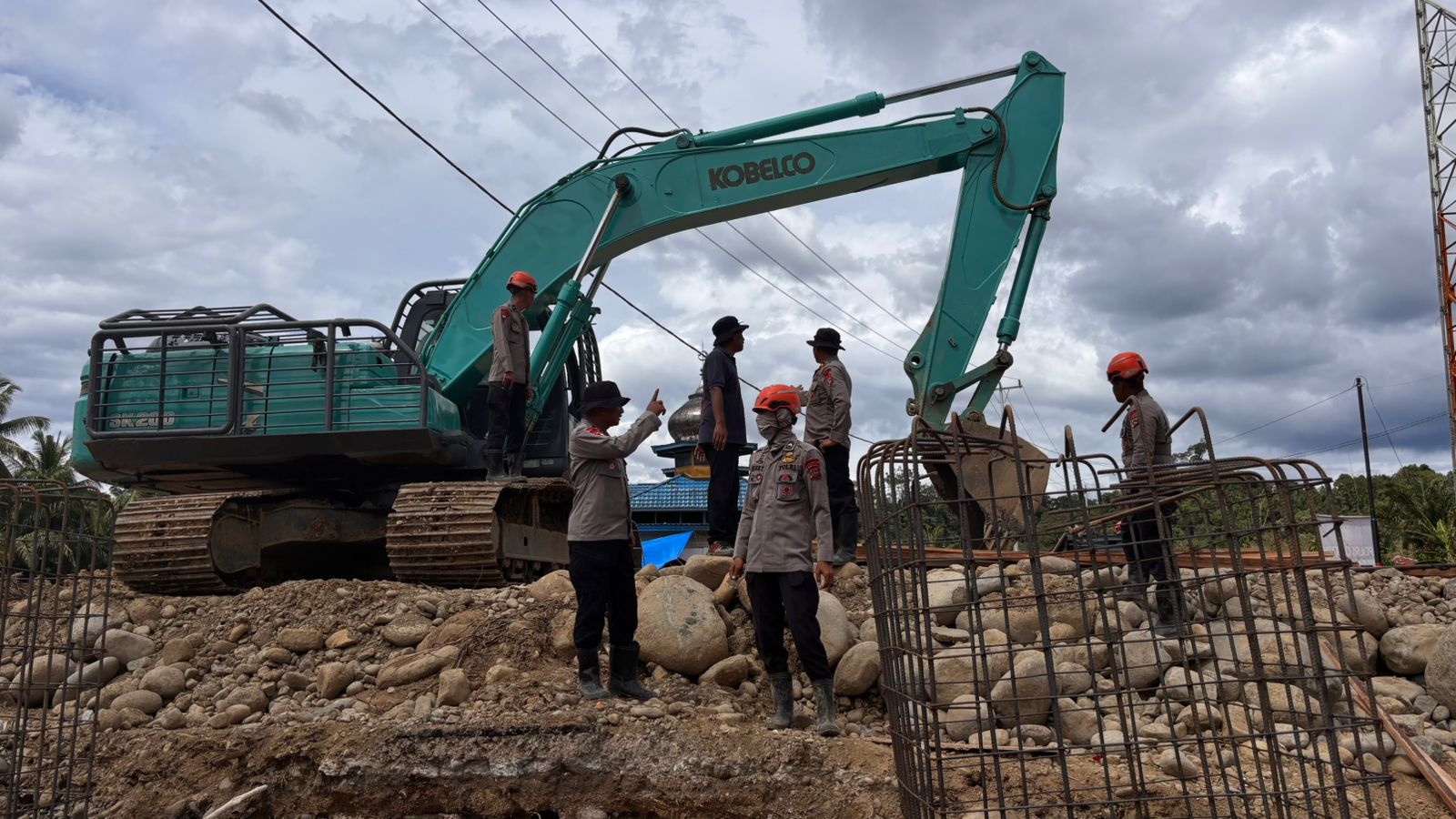 Pelaksanaan pengecoran pondasi jembatan tersebut dipimpin oleh *Ipda Eka Hadi Priyanto*, dengan melibatkan personel Satbrimob yang bekerja secara gotong royong dan penuh semangat. Pembangunan Jembatan Bailey ini diharapkan dapat menjadi solusi sementara namun vital untuk menghubungkan kembali akses transportasi warga yang sempat terputus akibat bencana.