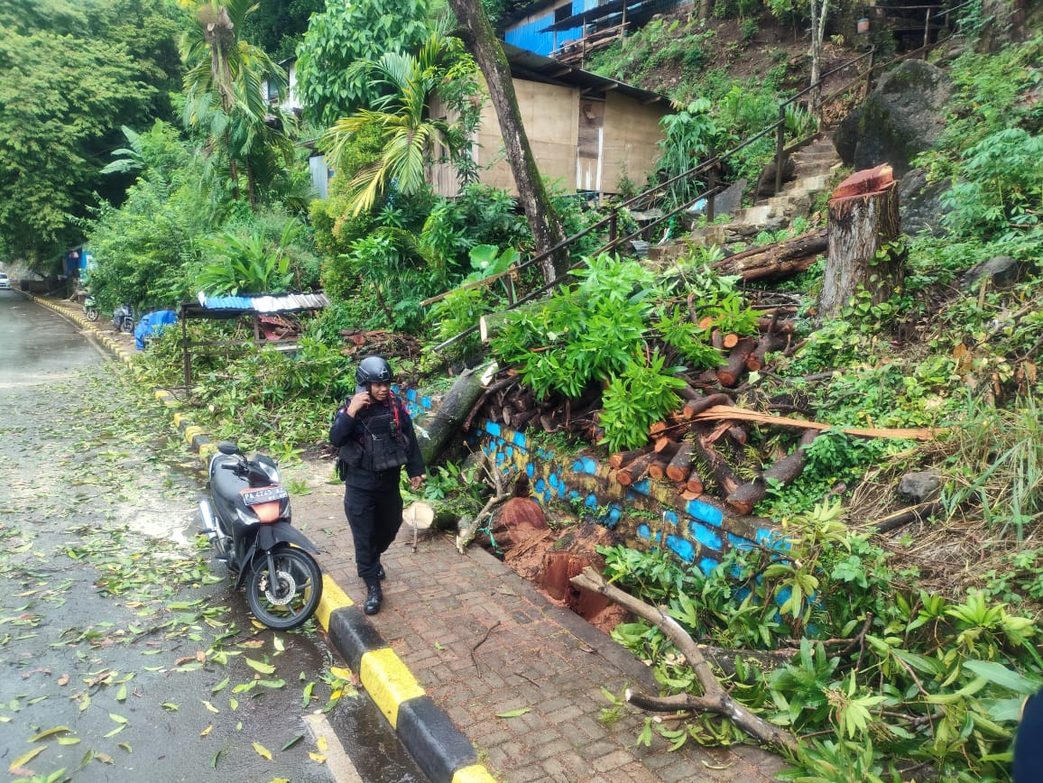 Jayapura – Personel Satuan Brimob Polda Papua yang tergabung dalam Sub Satgas SAR bergerak cepat merespons laporan masyarakat terkait adanya pohon tumbang yang menutup sebagian badan jalan di sekitar Jalan Lampu Merah Dok II.