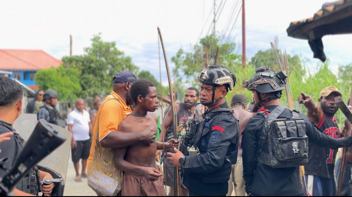 Kehadiran Personel Batalyon A Pelopor Satbrimob Polda Papua Tengah Dalam respon terhadap Adanya pertikaian suku tersebut sebagai upaya memastikan situasi kamtibmas tetap aman, terkendali, dan memberikan rasa nyaman bagi masyarakat di wilayah kabupaten nabire, Provinsi papua tengah, Minggu (30/11/2025).