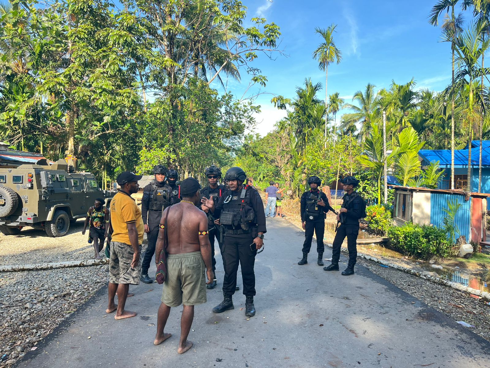 Pada hari Sabtu, 20 Desember 2025, Personil Siaga Batalyon B Pelopor BKO Polres Mimika Pengamanan Dan Patroli Antisipasi Perkembangan sitkamtimbas Pasca Konflik Antar Suku Di Kwamki Narama Di Pimpin IPTU Elison J. Dacosta.