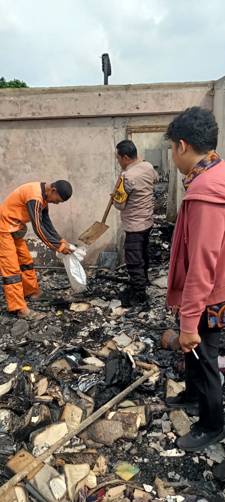 Di bawah terik matahari, aparat kepolisian dan warga bahu membahu membersihkan sisa-sisa puing kebakaran yang sempat melanda blok hunian tersebut beberapa waktu lalu.