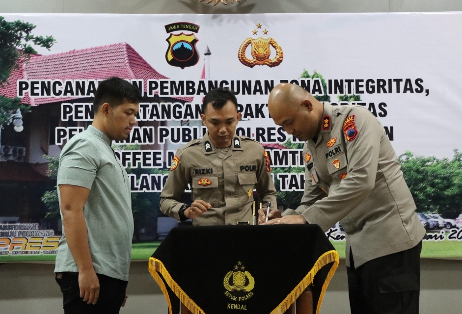 KENDAL — Polres Kendal mencanangkan pembangunan Zona Integritas serta melakukan penandatanganan Pakta Integritas Pelayanan Publik yang dirangkaikan dengan kegiatan Coffee Morning Kamtibmas menjelang Ramadhan 2026. Kegiatan tersebut digelar di Aula Tribrata Polres Kendal, Jumat (23/1/2026) pagi.
